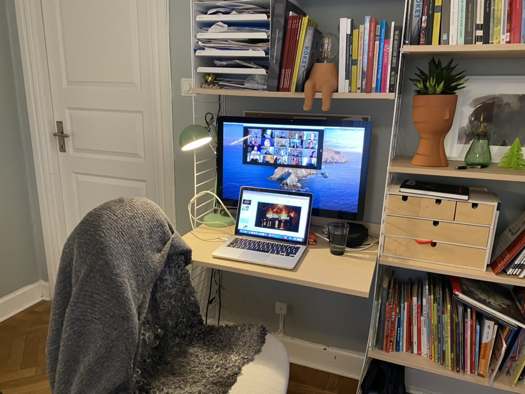 Till denna text har jag bifogat en rad fotografier som jag har fotat i mina egna två hemmakontor under pandemins nedstängning. Dessa diskuteras inte direkt i texten men illustrerar på ett fint sätt många av de situationer som texten tar upp.