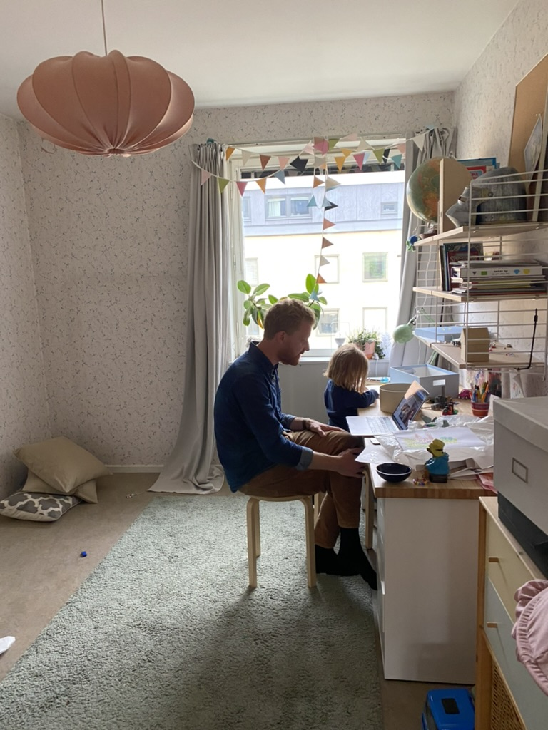 38-åriga Tobias bor i en villa utanför Linköping med fru och två små barn. Både han och hans fru har suttit hemma sedan pandemins start. I hans familj är det en av döttrarna som har fått flytta på sig för att göra plats för föräldrarnas arbete. Tobias och hans fru valde helt enkelt att låta döttrarna dela rum istället för att ha varsitt, och frigjorde på så vis ett rum som kan användas som kontor. Detta var något de tidigare funderat på att göra berättar han, men beslutet snabbades på grund av situationen med arbete hemifrån.