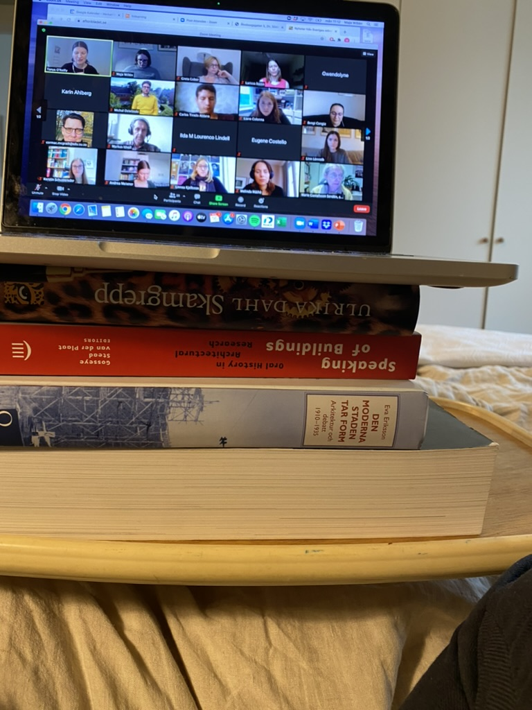 Materialet som denna text baseras på består i huvudsak av en intervjustudie som genomfördes under senvåren 2021 med människor som arbetat hemifrån helt, eller i viss utsträckning, sedan mars 2020. Jag har totalt samtalat med 9 personer i olika åldrar och med olika erfarenheter av att arbeta hemifrån. Dessa intervjuer har genomförts via zoom med en semistrukturerad uppläggning (Fägerborg 1999 och Kvale 1997). Frågorna har rört hur mina informanter har upplevt det senaste årets speciella situation, hur de har lagt upp sin arbetsdag, hur deras relation till bostaden har förändrats och vad de har gjort för att anpassa bostaden till att kunna arbeta hemifrån. Samtalen har dock ofta också berört existentiella frågor om exempelvis vad som krävs för att känna sig hemma, om vilka utmaningar avsaknaden av sociala kontakter skapar och om drömmar om framtiden.