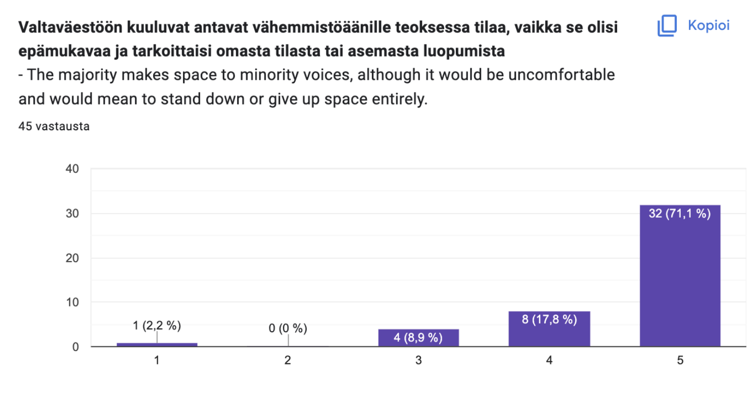 3) The project facilitation encouraged continuous feedback from the minority representatives and committed input from them was key to enable the project in the first place. In addition, several crew members were assisting the creation by providing their expertise and support regarding the marginalized in the project. Discussions on the artistic content and representation were held throughout the process. Yet, even though the production was hiring external support personnel to avoid putting too much responsibility on the marginalized crew members, many of them ended up doing unpaid and invisible work by taking responsibility for developing safer working conditions, providing care for fellow crew members, and pointing out potential pitfalls in the project. Although the project tried to put emphasis in planning the productional circumstances, even more thorough pre-planning and risk-analysis would’ve been needed.