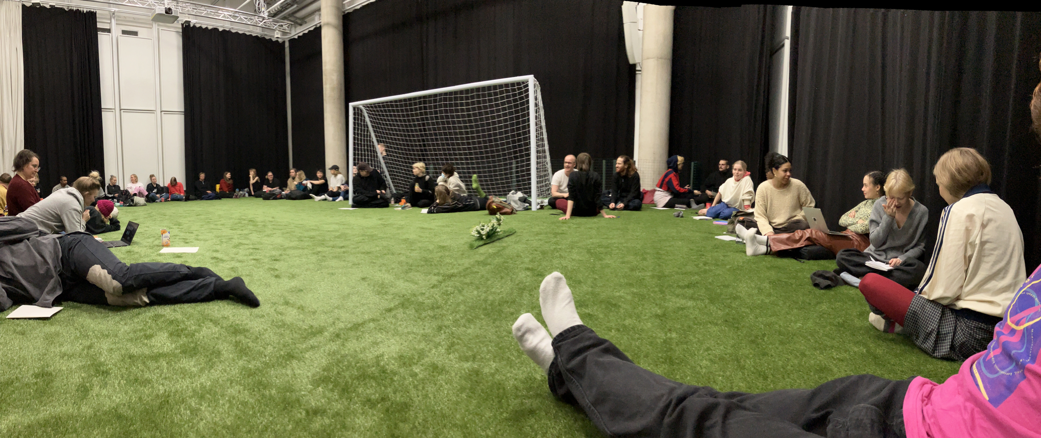In February 2022 I launched an open call to select the entire filmmaking crew to create a collaborative feature film from scratch. The selection was based on motivation letters of the applicants on the theme “Finnish national identity as part of coloniality”. The selected crew of 72 people consisted of performers, artistic and technical crew members, production staff, a few researchers, and a mini-audience of 30 members who would be the primary audience of the forthcoming film. The project started with this whole group coming together for 5 days in August 2022 to discuss and decide, what kind of a film we want to create together and what kind of methodologies should be applied to execute the “Parvet” project.