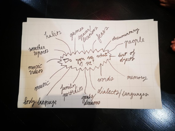 The aim of the 5-day August workshop was to brainstorm and collect material for the upcoming film and discuss working methods with the whole group. This was done through individual exercises, mini-group sessions, by making artistic demos - and through a few larger group discussions. Outcomes were collected on Google Drive and on written papers. The working style emphasized documenting every working session and summarizing key points of each group discussion. The next step after August was to organize, curate and start working on a written concept from the collected materials. This concept paper would then work as the foundation for the script process and artistic design.