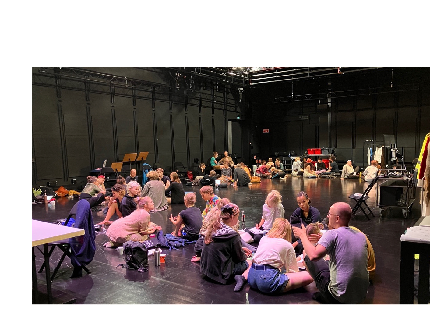 Through the open call, the aim was to find a diverse group including students, professionals, amateurs as well as people outside these groups and outside the cultural circles. Out of the 333 applications received, producer Emilia Haukka from Aamu Film Company and I selected 80 individuals to participate in the project. The selection was based on the motivation letters and the CVs of the participants. For the performers and audience, the selections were made prioritizing personal motivation. When selecting the technical crew and heads of artistic departments, prior experience in the field of filmmaking was emphasized, as the project would be made as a professional feature film production. The call was asking applicants to send an open motivation letter or a video regarding the theme “Finnish national identity as part of coloniality”. Also a CV was required from the applicants. Through an open call to the entire crew, I aimed not only to gather a team passionate about the theme but also to disrupt the way film crews are assembled in the Finnish Film Industry. Especially for roles in the head of departments: set design, cinematography, costume design etc., there are rarely ever open calls. People are invited or scouted through internal searches. Cronyism lives strong.