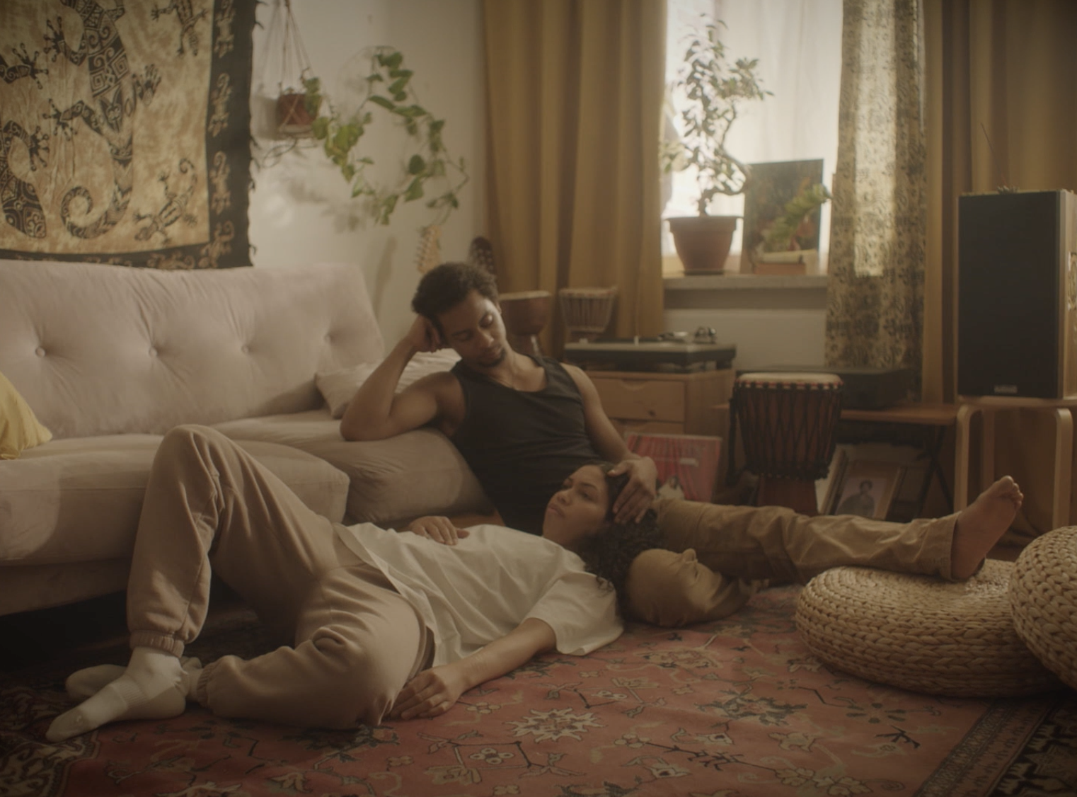The set design followed a similar approach as the costume design. As an example of collaboration with the performers, set designer Una Auri and actors Yolanda Correa Brown and Aaron Bojang collaborated to create a home that belongs to a Finnish POC couple. It was important for performer Correa Brown to portray her character Valeria’s home as a safe haven, and as a warm home of a loving POC couple. The actors took part in designing the set and selecting the props appearing in the scenes. The actors also brought some of their personal belongings to be used as props, such as Aaron Bojang’s instruments.