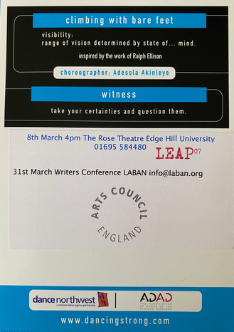 These examples of the main thrust of feedback from producers and the dance decision-makers at the time reveal the climate for dance in the UK in 2007/8. A climate that meant my work was not centered but rather how people read my identity was the focus. The work was not engaged with on its own terms when I sought feedback and support. The wound was then the un-visibility of my artistic practice. I wrote about this in the chapter 'Narrating Spaces, in Black Women in Dance: Stepping out of the Barriers, edited by Pawlet Brookes.