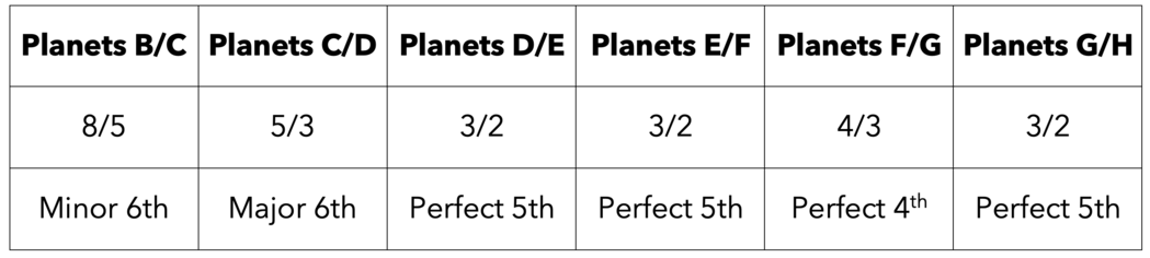 One of the most striking features of the planetary system TRAPPIST-1 is its harmonicity. The orbital periods of the seven planets are locked in a chain of resonances (Luger et al., 2017). This means that the relation between the orbits of neighbouring planets can be expressed as simple ratios. For example, while planet H rotates twice around the star, planet G rotates three times. These ratios can be expressed musically as intervals as follows: