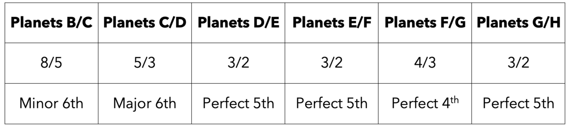 I generated harmonic material using mainly two different sets of data: the orbital period ratios and the distance of the planets to the star. A general idea from the beginning of composition of these two pieces was to engage with the concept of “music of the spheres”3, aiming to create a harmonic sound-world unique to the TRAPPIST-1 system.