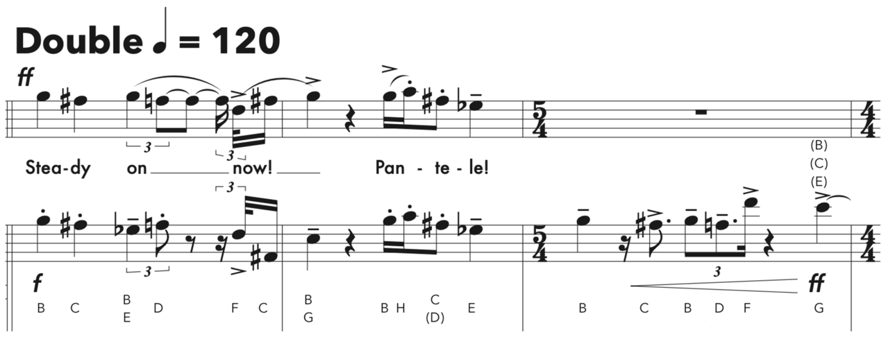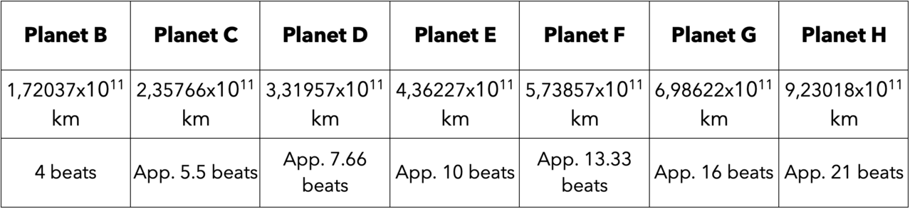 I also explored expressing the distances between planets rhythmically. For that, I used as a basis Planet B (the first of the system), converting its distance to the star into a full 4/4 bar, and generating the other rhythmic units in relation to it. This transformation is mainly used to create rhythmic patterns for melodic generation.