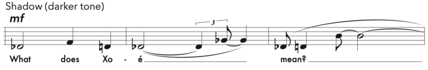 In The Flowering Desert there are two main banks I generate melodic material from: the first (Figure 11) combines the rhythmic units based on distances (Table 5) with the music scales based on distances (Figure 3), and the second combines the rhythmic units based on rotations (Table 3) with the music scales based on distances (Figure 3). Each of these two banks has two different versions: one using the ascending music scale, and the second as its inversion, using the descending scale (Figure 3). The different resultant melodic shapes from these banks are useful to define characters in the piece. This can be seen, for example, in the character of Pantele in Scene 1, when her “Self” and “Shadow”[21] personalities are presented. The “Self” uses the material created using the descending scale, which sits in a higher register and is therefore brighter for the voice (Figure 12). The “Shadow” uses the material created using the ascending scale, which sits in a lower register and is darker for the voice (Figure 13).