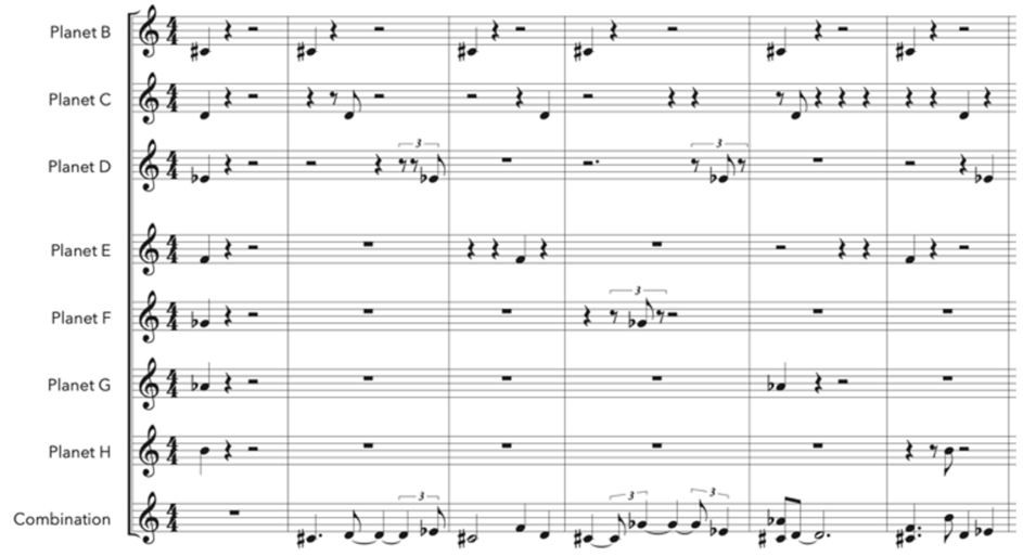 To represent melodically the TRAPPIST-1 planetary system and other concepts related to its discovery, I generated different banks of melodic material that combine the rhythmic units linked to each planet with their correspondent pitches in the music scales or in the chords. The banks are the result of joining seven individual lines, each with the specific material of a planet. They start with a full alignment of the 7 planets, generating a cycle of hundreds of thousands of bars until the next full alignment (Figure 11). The use of this technique recreates melodically the undulatory shape of the TRAPPIST-1 transits on the data plots[20]. This shape is the result of the cyclical repetition of notes associated with the shorter rhythmic units, which create a “bottom” line from which the other notes take off and come back.