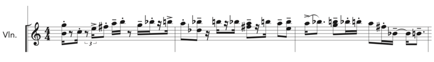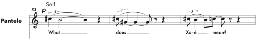 To choose melodic fragments from these banks, and due to the impossibility of going through all the generated material[22], I decided to use TRAPPIST-1 data. To detach myself from a personal arbitrary decision, I asked Dr Amaury Triaud to find a series of numbers specific to each planet or events related to the discovery of TRAPPIST-1 that I could use to determine where to get material from in the banks[23]. Each of those numbers marks the bar number in the banks to draw the melodic material from. Then, the melodic material will be associated with the specific planet or concept linked to the numbers Dr Triaud provided. Figures 12, 13, and 14 show, for example, melodic material associated with the character Pantele[24]. This procedure, drawing on a certain indeterminacy and chance[25] as a composition technique, recalls the use of the I Ching by John Cage to determine musical parameters in Music for Changes (1951) and Xenakis’ stochastic music[26], which was informed by scientific data and processes[27].