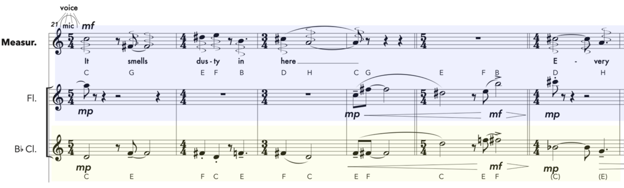 Another technique I used to combine rhythmic and harmonic material in The Flowering Desert and TRAPPIST-1 is isorhythm[28]. I generated different taleae using rhythmic units or combinations of them which I linked to a particular idea. For example, to represent the idea of the triple transit, a particular important moment in the discovery of the TRAPPIST-1 system, I combined the rhythmic units of the three planets responsible for this event (planets C, E, and F) into a talea. Similarly, I generated different color using pitch combinations from the harmonic material. Some examples of color are: the order of discovery of the planets (C, G, E, F, B, D, H), the triple transit (C, E, F), or the two planets theorised and spotted months later (D, H). We can consider that the generation of the banks of materials previously discussed is also a form of multi-layered isorhythm, as it combines the unique taleae and color of several independent lines, each of them linked to a planet.