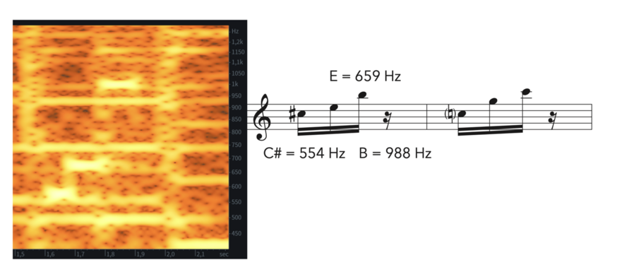 Similarly, I transcribed the sound of an Amazon scanner from another commercial to inform the composition of the character Alexis the Scanner[60]. The transcription results in an, approximately, ascending C#-E-B quick gesture. However, I decided to keep just the ascending shape and the quick gesture, slightly modifying the harmonic aspect to match tonally the Amazon gesture presented in Figure 18.