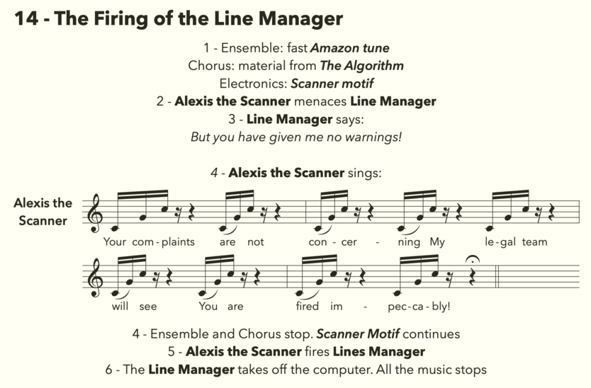 Alexis starts the aria using the scanner motif [00:00:01] and the pitch contour of the Amazon tune [00:00:09]. The chorus loops a short motif created with the pitch material of the Amazon tune divided in two voices [00:00:16]. Alexis then sings using the Amazon tune with a rhythmic design derived from the Poor Old Associate hoodening song [00:00:39]. The climax of the aria uses the same pitch and rhythmic material with octave changes to expand the vocal register to increase the lyricism, showcasing the preoccupation of the scanner with the resurrection of Swing [00:01:23]. After Alexis’ aria, during its speech to the Line Manager, the chorus slightly varies their line to be more static, still using the same pitch material [00:02:05]. The melodic line from the climactic point of the aria will also be replicated by the Line Manager, following the termination orders of the machine [00:02:50].