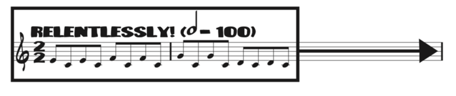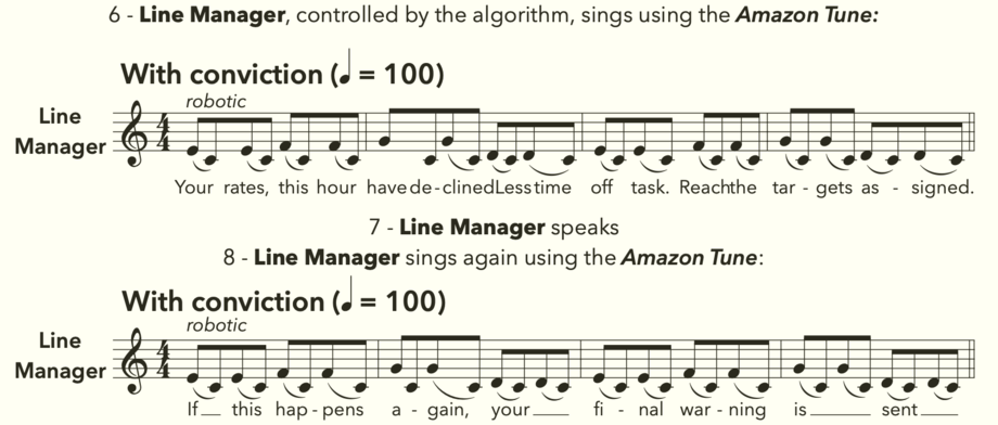 In relation to the research on workers’ conditions at Amazon, we decided to engage with the recurrent idea of inhuman repetitiveness and relentlessness at work from the interviews, represented in the answers seen in 2.1.2.1.1 Autohoodening: The Rise of Captain Swing, such as “we are not treated as humans, not even as robots”. To represent the corporate giant in the piece, I decided to appropriate a sample from an Amazon commercial that featured a minimalist soundtrack in C[58]. This music seemed fitting to the company, especially if we look at the use of minimalist music in media “as a sign for the machine and rationality” (2014, Eaton: 3). My idea was, however, to use it more as a representation of "dehumanised assembly-line labour” (1975, Gottwald), an idea derived from early reviews of minimalist music. Therefore, this short motif in C is resignified from the positiveness of the corporate video that it accompanies to representing the idea of relentlessness, also associated with the company[59]. This melodic gesture is then used as the main musical material for the whole work.