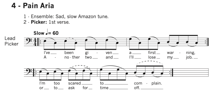 As a collective, Infinite Opera and Post Workers Theatre[52] borrowed many elements from the custom of hoodening for this production. This includes themes, script-writing style in rhyming couplets, costumes, Morris dance choreographies, or theatrical rituals. From the composition perspective, I engaged with the custom of hoodening by borrowing a song performed in the past by the hoodeners, Poor Ole Hoss[53]. In the song, there are two points of view: the owner complaining about a horse not fit to work anymore, wanting to get rid of it or letting it die, and the horse reflecting upon its decay and its fate. This song seemed fit to represent the workers in conflict, being forced to work relentlessly to not be replaced. I transcribed the song, changed the lyrics[54], and slightly modified it at certain points in response to the plot[55] (Example #14).