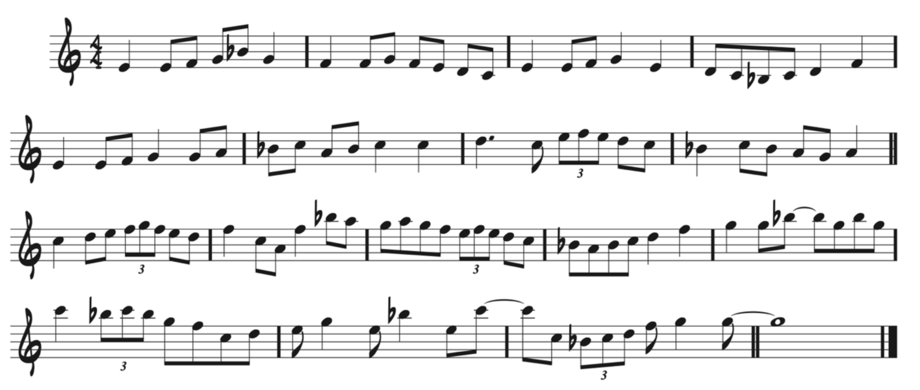The “Introductory Song” of Autohoodening: The Rise of Captain Swing (Example #16) presents the borrowed musical materials mentioned before (hoodening song, Autohoodening reel, Amazon tune, and the scanner motif) in combination with other borrowed elements relevant to the piece such as: