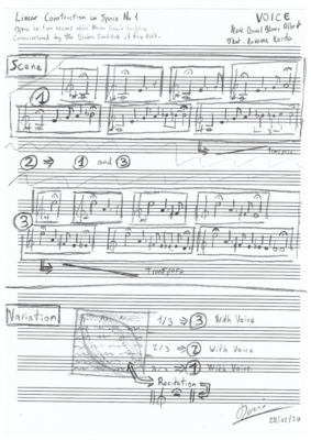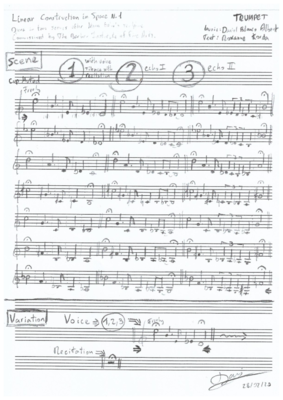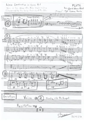 In response to Naum Gabo: Linear Construction in Space No. 1, site-specific music-theatre piece for voice, flute, trumpet and violin. March 2020.