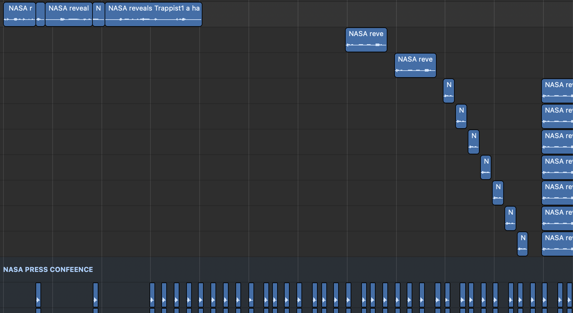 Appropriation is employed in the composition of the last scene of TRAPPIST-1, “Announcement”. This scene deals with the idea of science dissemination and the rapid impact TRAPPIST-1’s research had on society. One of the reasons for this rapid impact is that three of the planets in the system are in the habitable zone. This fact also led to scientific clickbait, which Gavin and I found interesting. To directly engage with this, the scene starts with a borrowed recording from the NASA official announcement of the discovery of the planetary system, triggered at the very end of the previous scene. We then pitched this recording to the harmonic material associated with the planetary system, fragmented it, and sampled it[64]. With this material, we created celebratory music that reflects the moment of euphoria after the discovery and the noise generated by it. Once this euphoric section fades, we then proceed to present the system more calmly, as an extension of the press conference. We borrowed accurate descriptions from the characteristics of the star and the seven planets of TRAPPIST-1, and we delivered them with computer-generated voices that imitate a spokesman and a spokeswoman. These computer-generated voices are pitched accurately to the notes associated with each planet and the star, and they rotate in the electronics according to the orbital periods of each planet. With this technique, we recreate the musical material from the beginning of the piece (Example #8 in 2.1.1.2.1 TRAPPIST-1), but with the explanations behaving sonically as the celestial body that they depict.