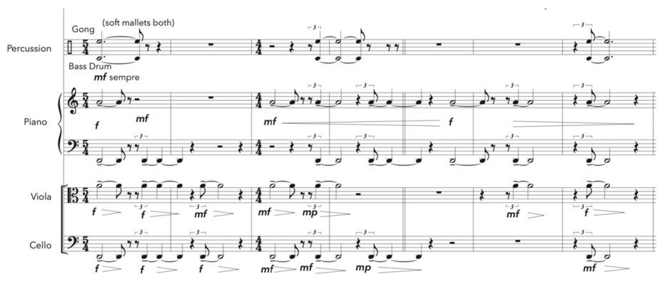 Pulsation is featured in this scene as two different processes. The first consists of a musical motif that repeats with cyclical changes in orchestration and volume (Figure 25).