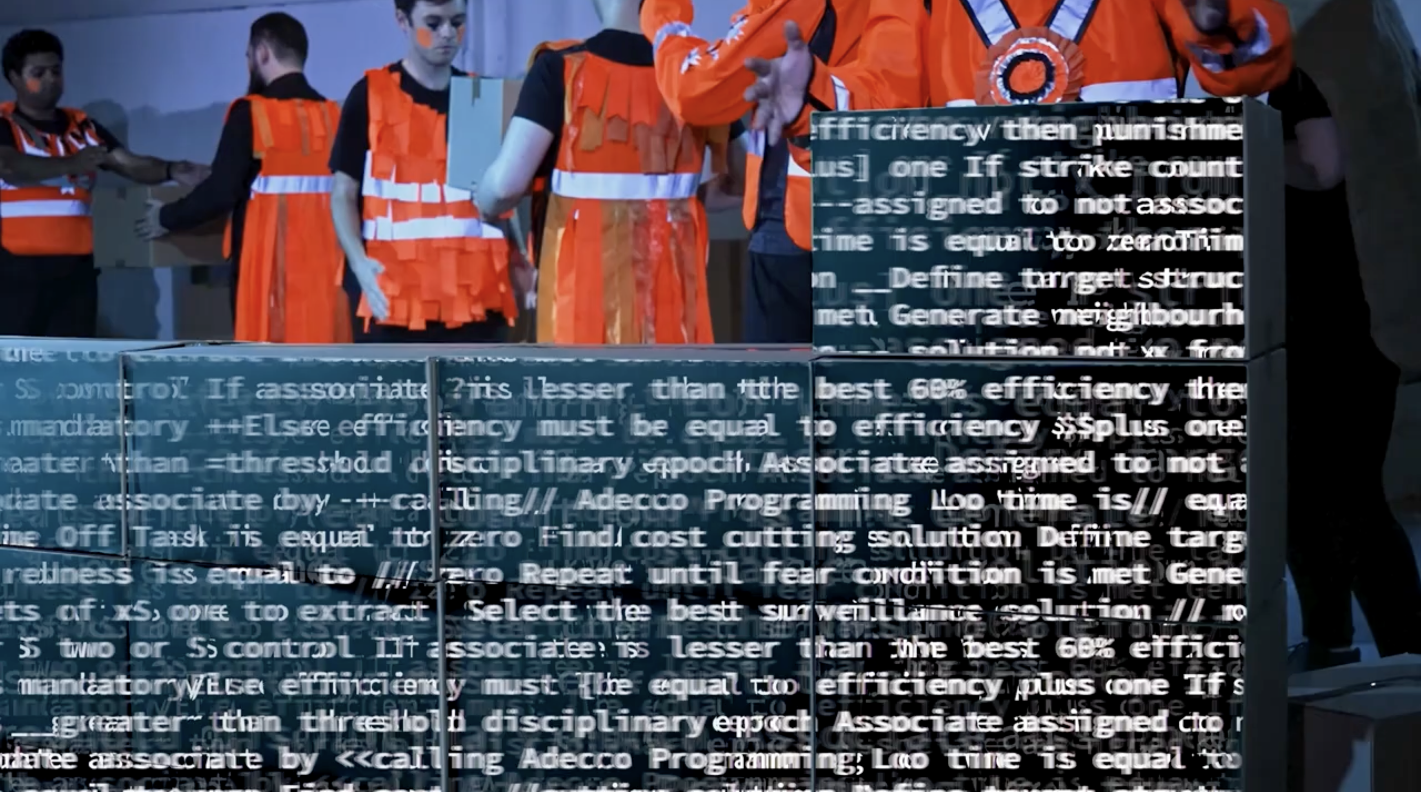 Representation of the algorithm’s control over the workers by a process: the relentless playing and repetition of different motifs associated in the piece to Amazon and the workers. The scene is introduced and ended by a sung short line describing how the algorithm continuously analyses the workers’ performance.