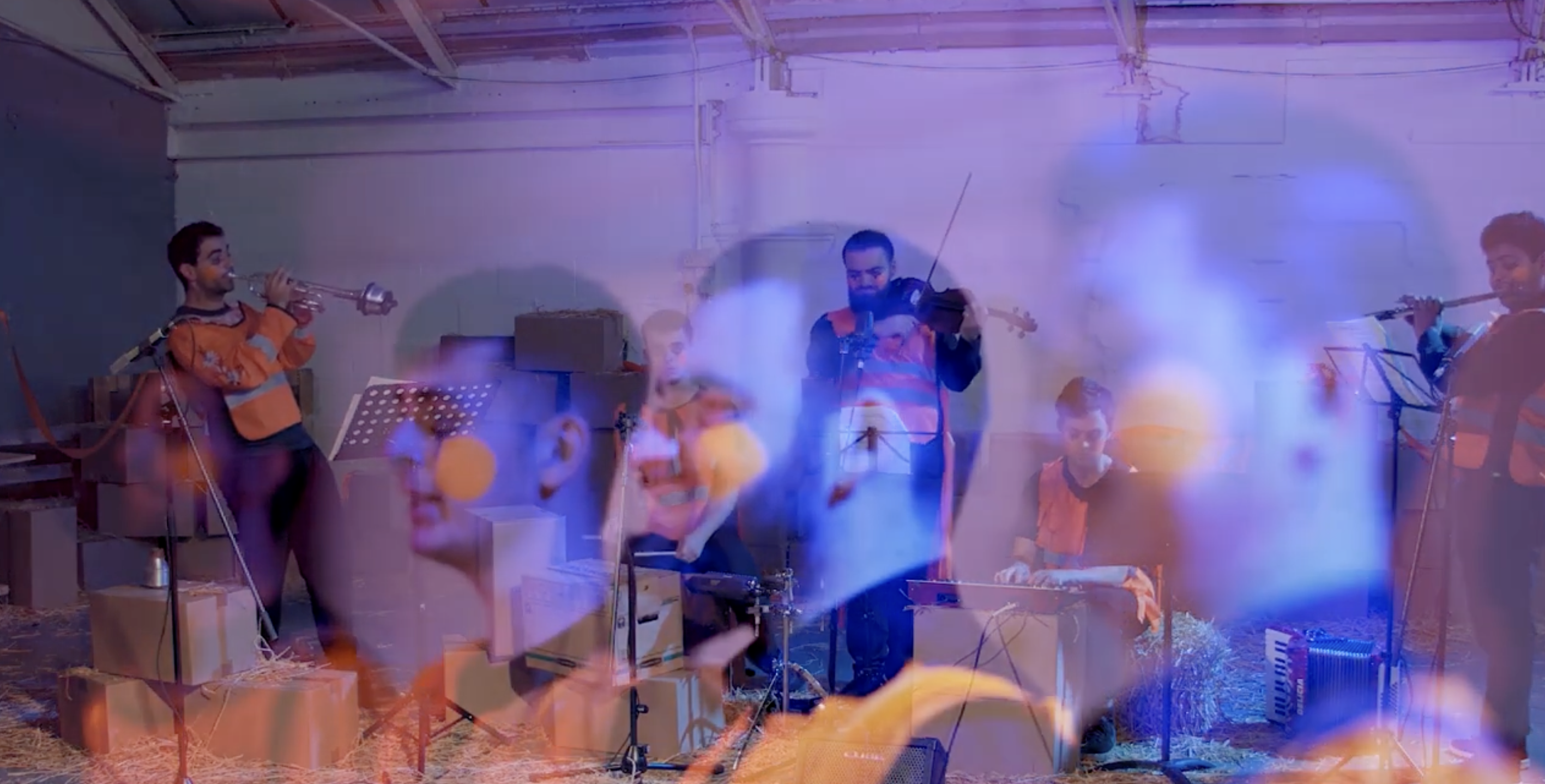 Layering is present throughout the whole work of Autohoodening: The Rise of Captain Swing. Musically, there was first a practical reason behind it. The piece was collectively created during the COVID-19 lockdowns in late 2020 and early 2021[15]. The interdisciplinary collaborative creative process for this piece needed to happen online. We used techniques of Zoom-theatre such as the use of effects in the background of the videocall, the connection of external musical software through virtual audio inputs, or the strategic manipulation of the layout of the videoconference[16]. In order to embrace the unavoidable latency (or sound delay) in the video calls during rehearsals[17], I decided to design the composition of the music as a series of independent blocks of material stacked in layers that would not necessarily need to be synchronised to be effective. This allowed us to create the first version of this work in the form of a Zoom-theatre extended trailer for the project[18].