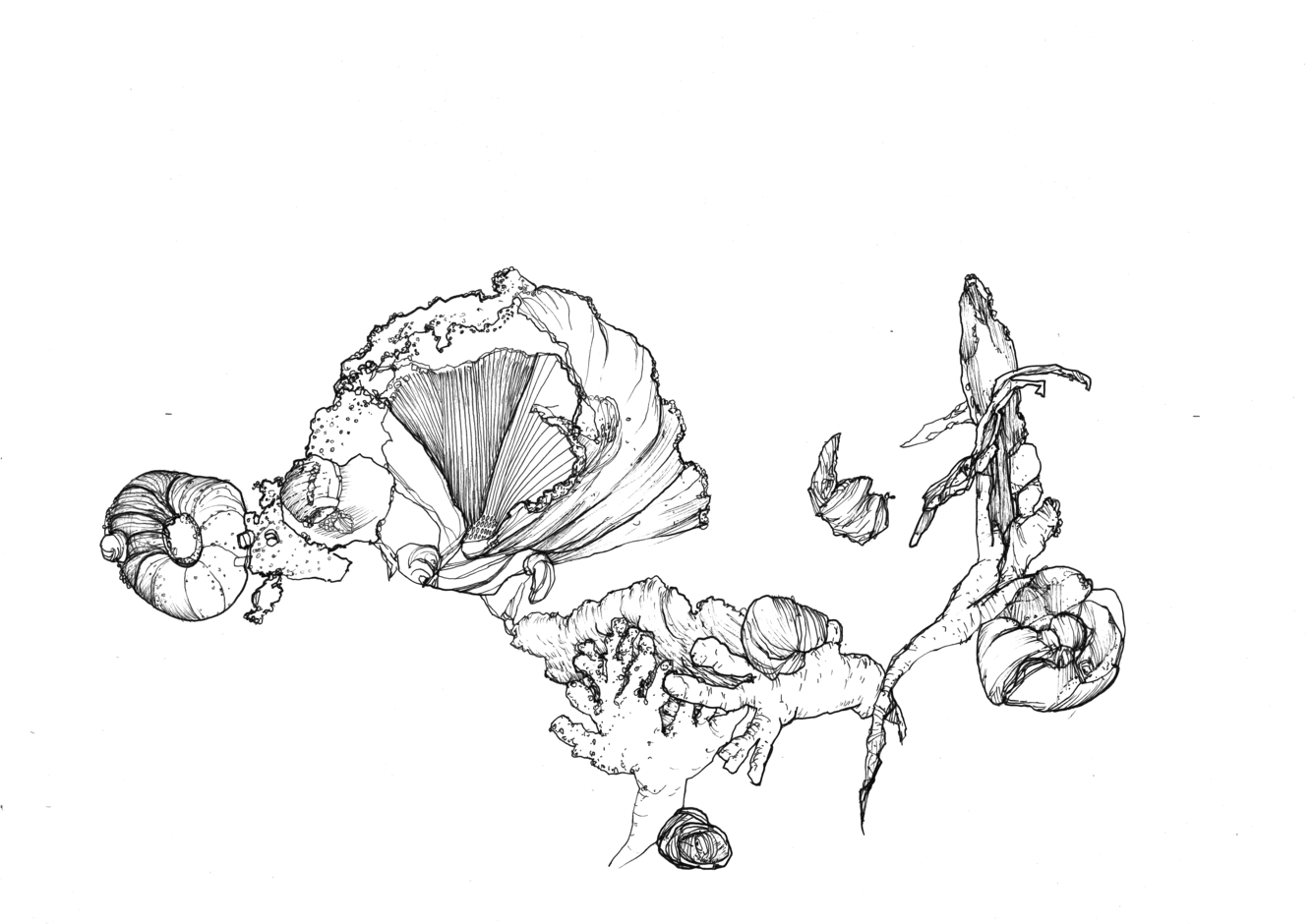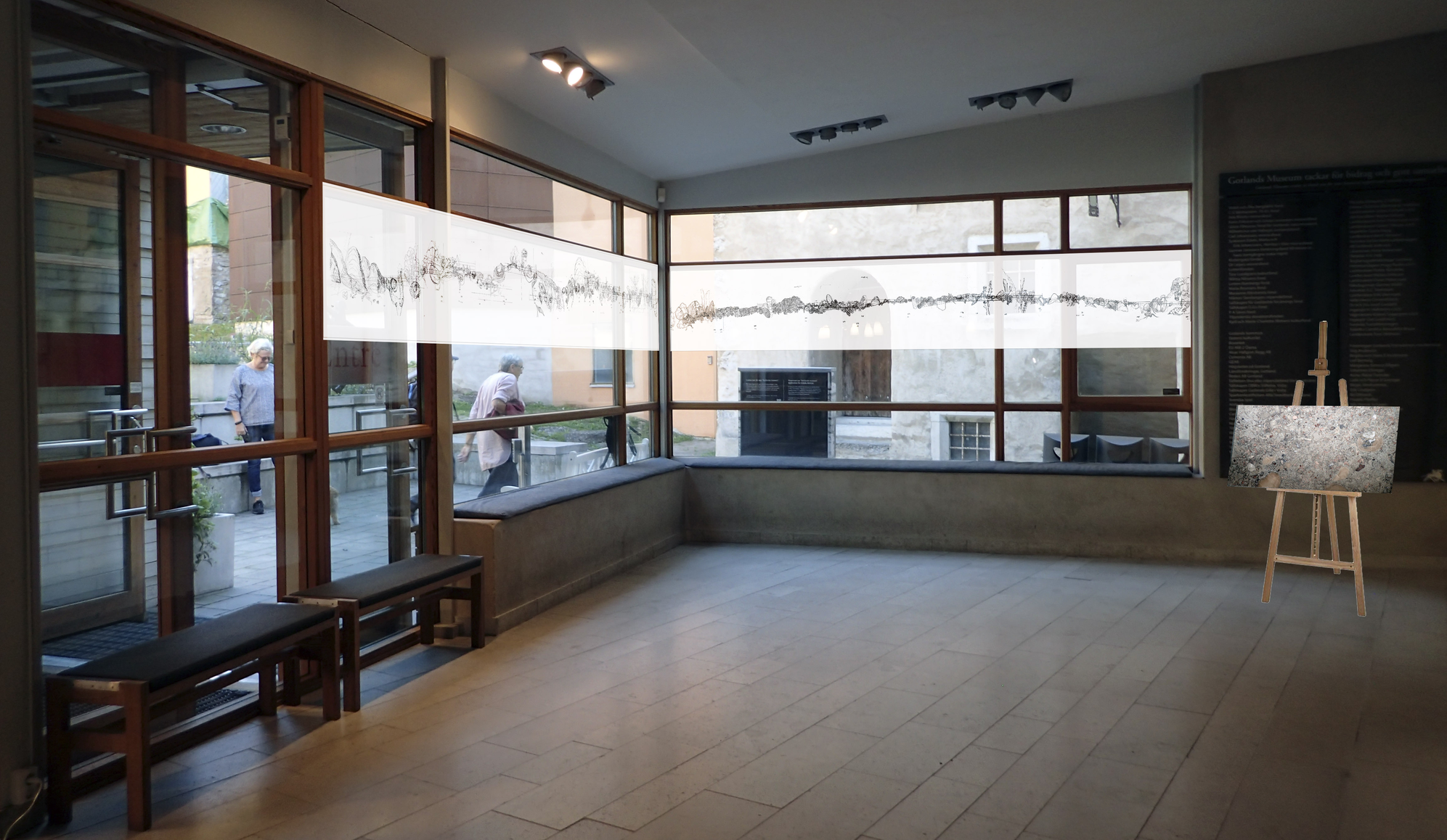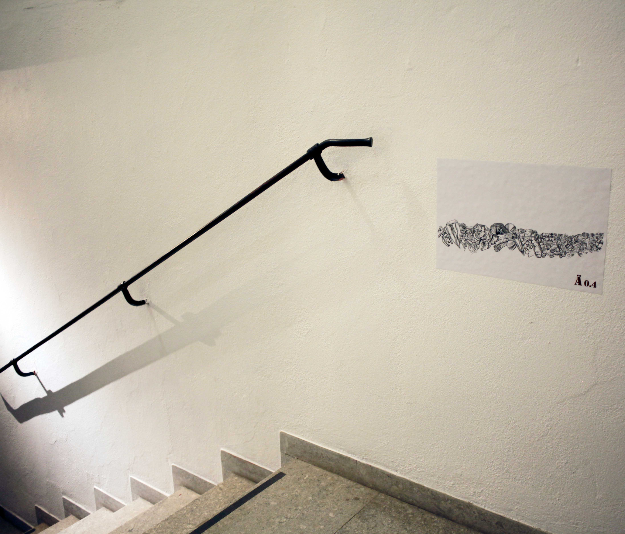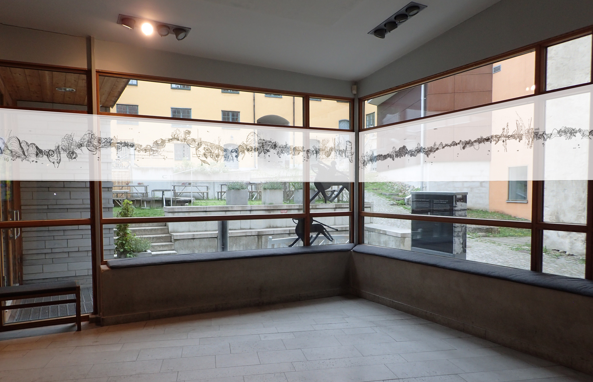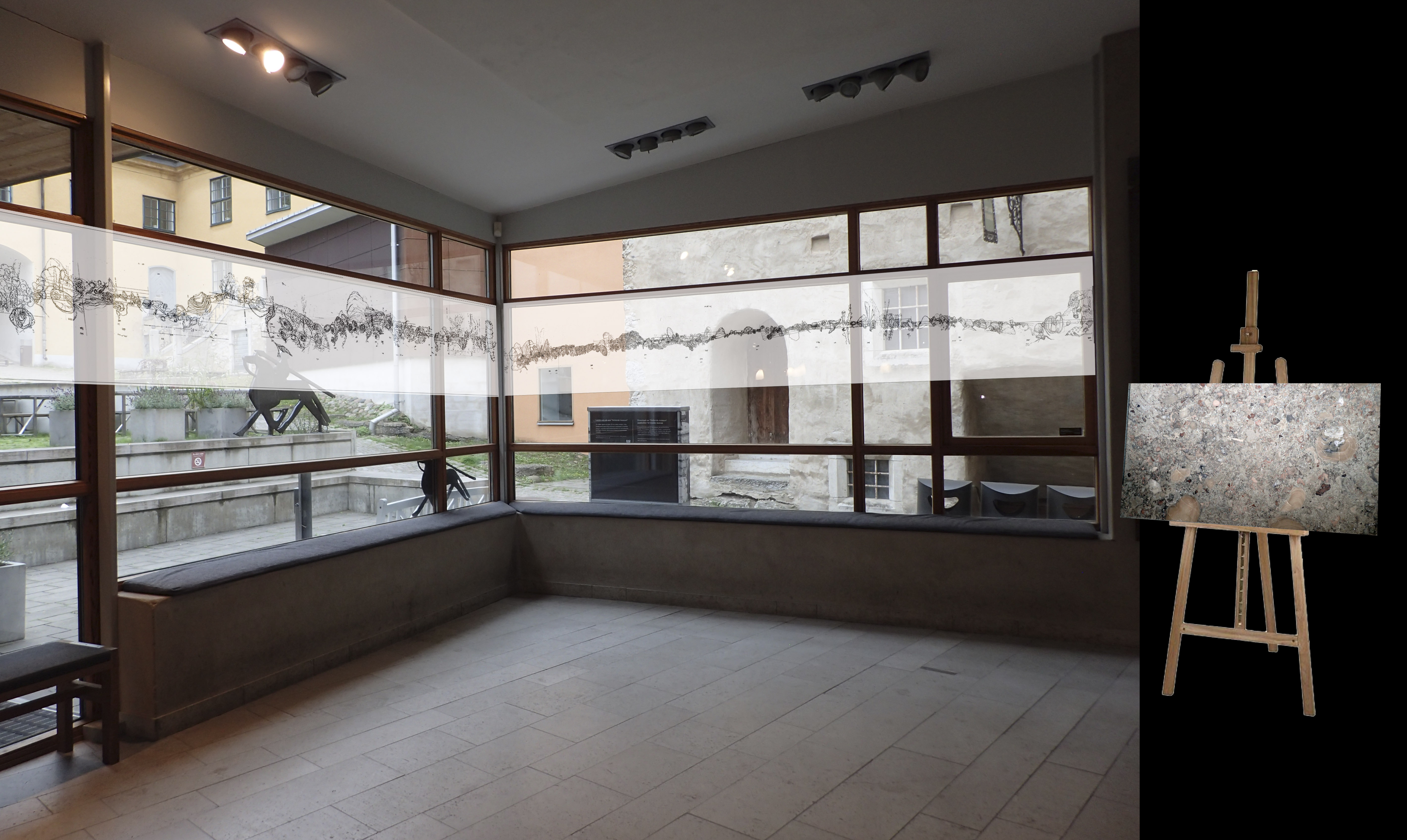 Based on the fossil imprints found in the Historical museum's three staircases, Närhinen endeavours to depict and to re-trace outlines of the coral reefs by means of ink drawings drafted on translucent plastic film.