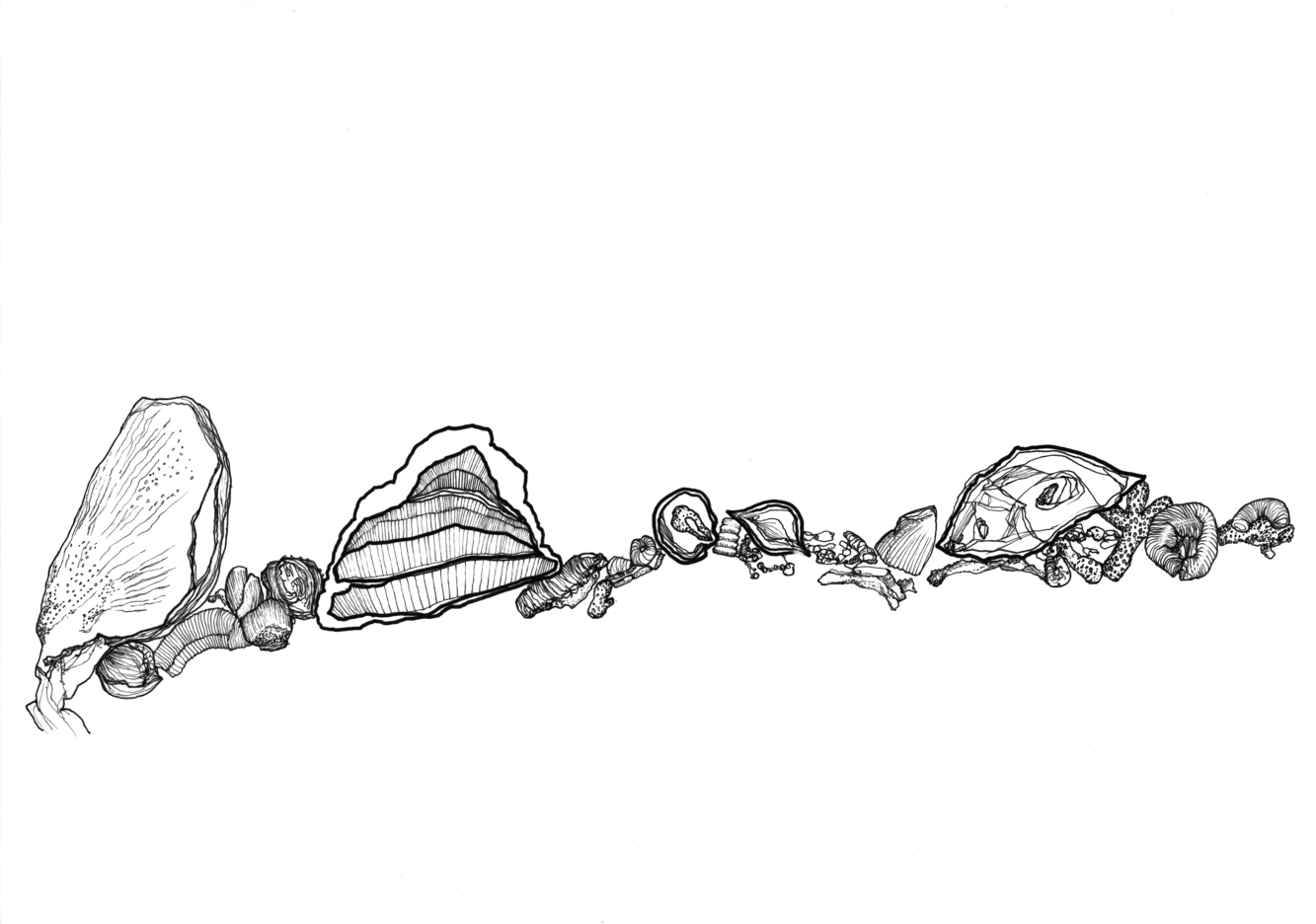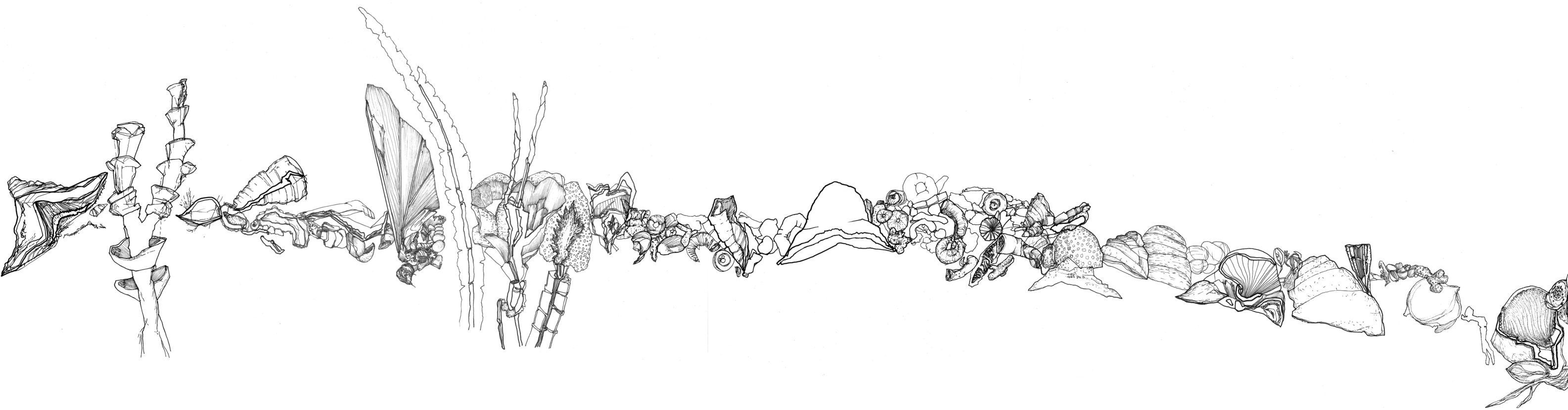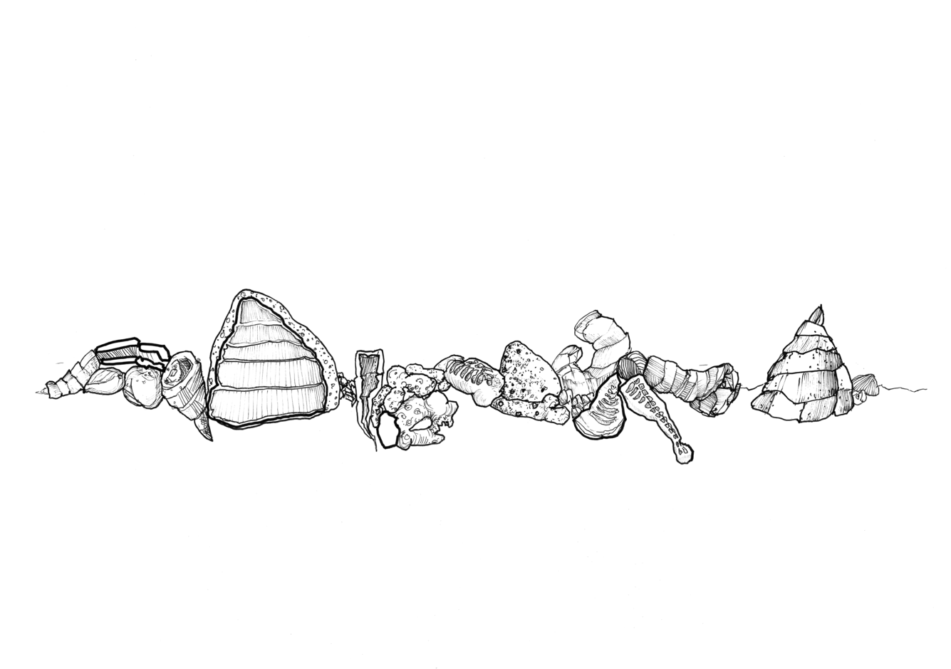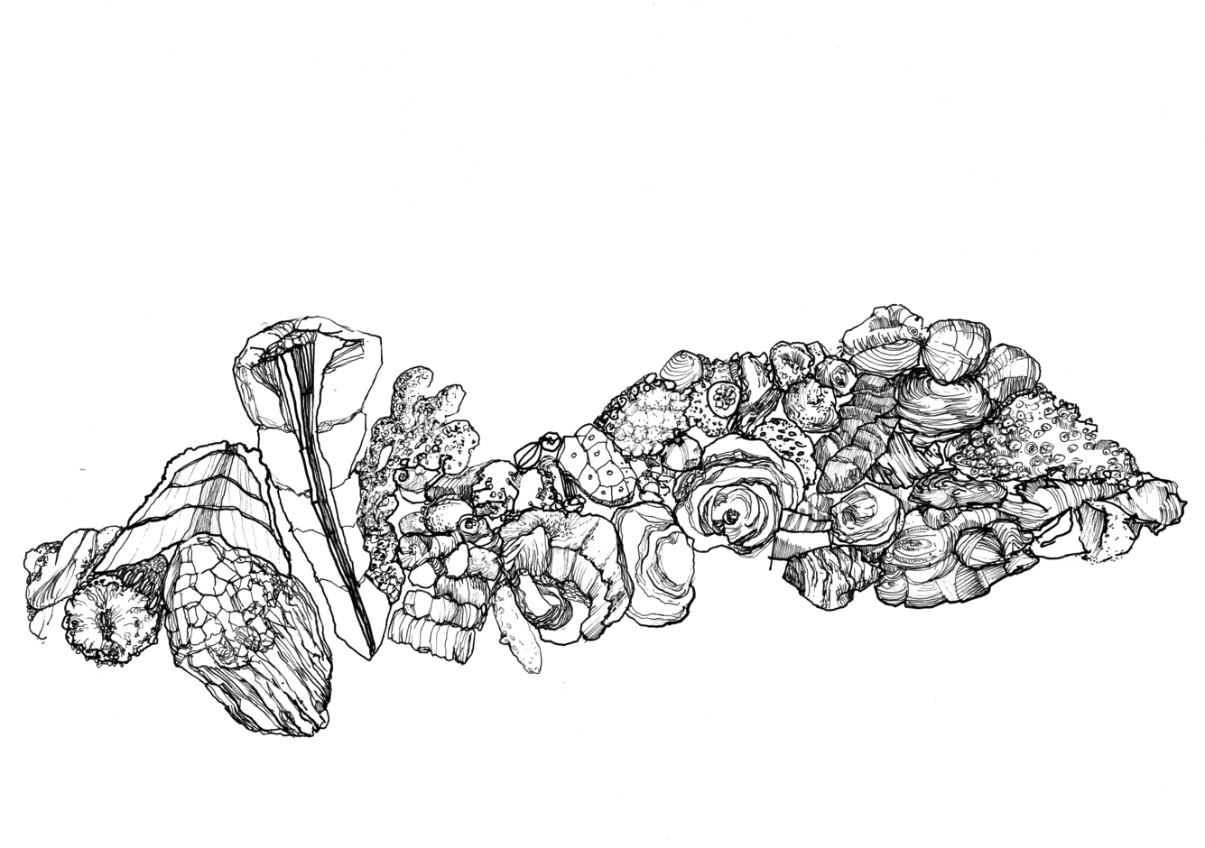 Based on the fossil imprints found in the Historical museum's three staircases, Närhinen endeavours to depict and to re-trace outlines of the coral reefs by means of ink drawings drafted on translucent plastic film.