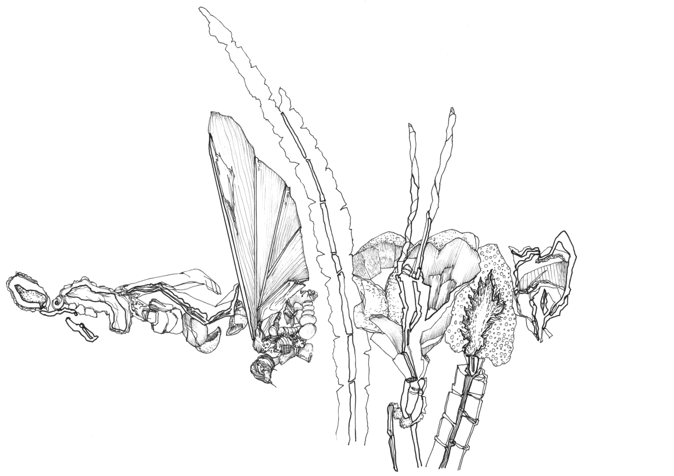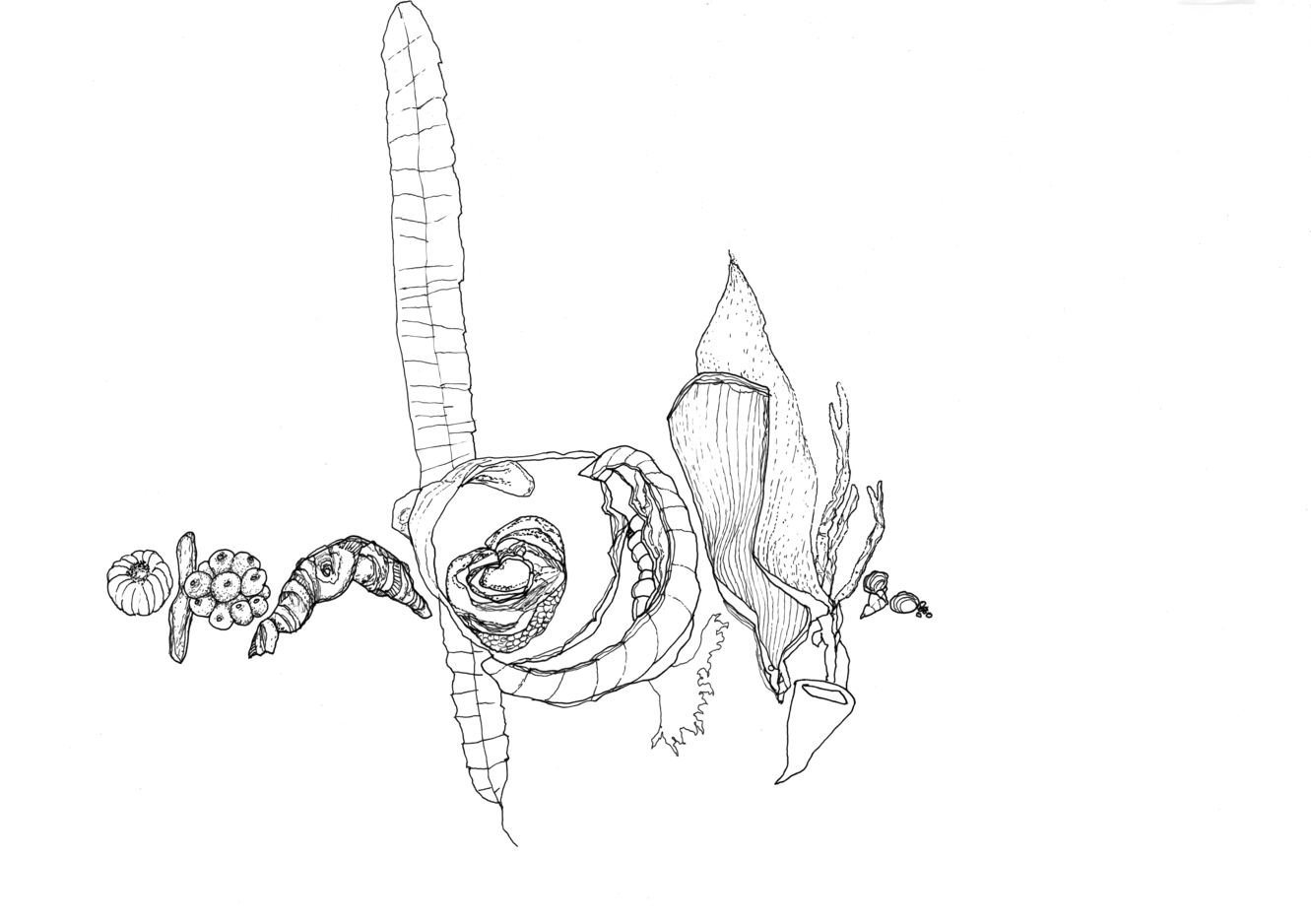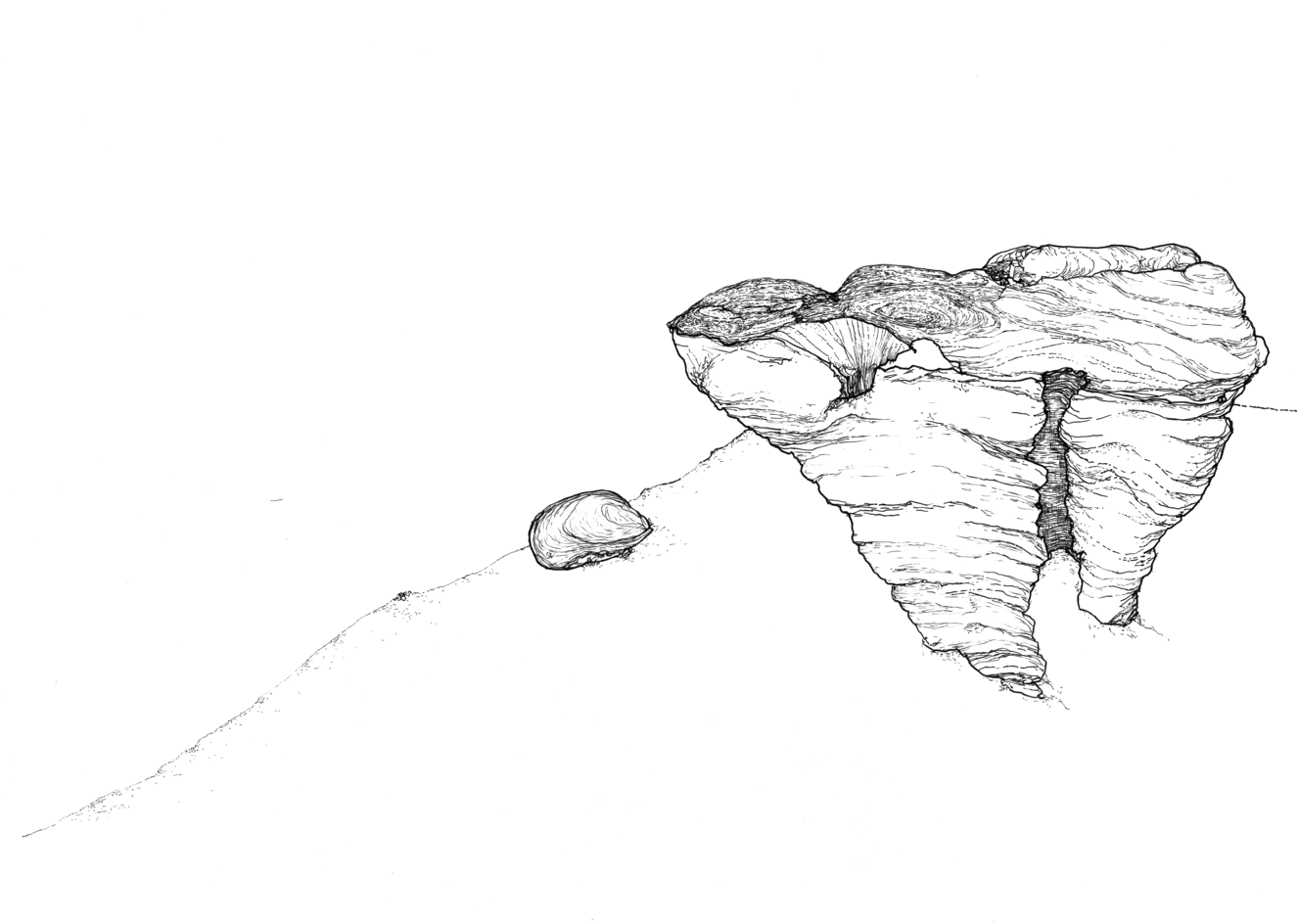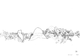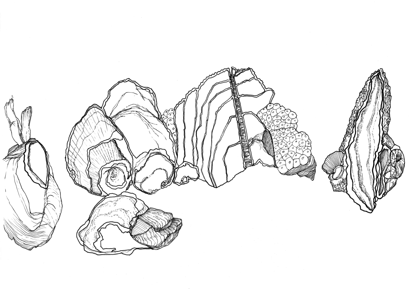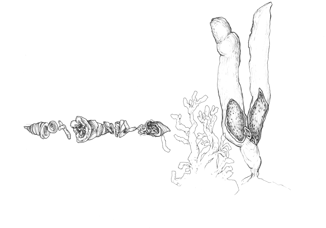 Based on the fossil imprints found in the Historical museum's three staircases, Närhinen endeavours to depict and to re-trace outlines of the coral reefs by means of ink drawings drafted on translucent plastic film.