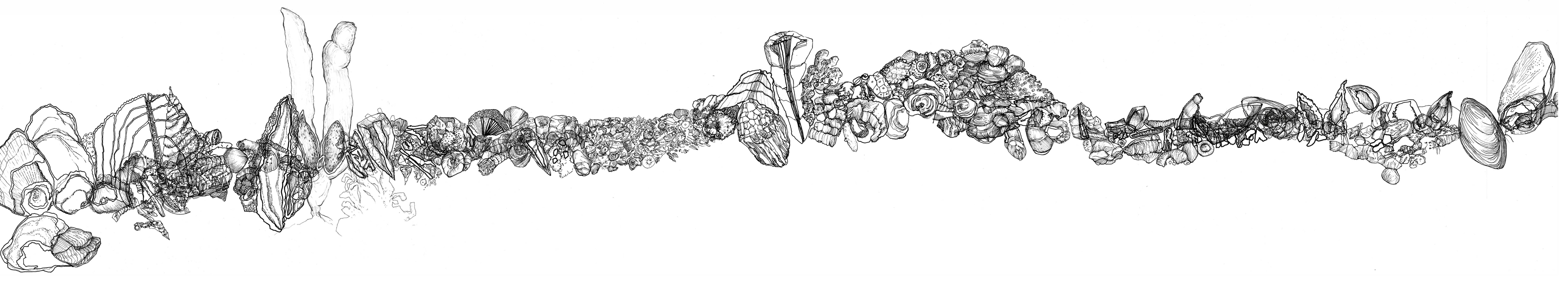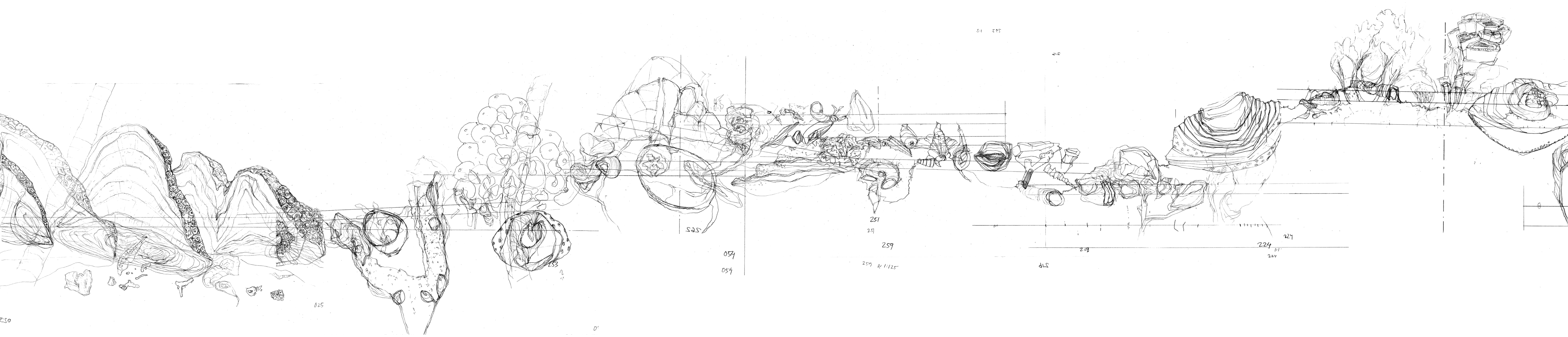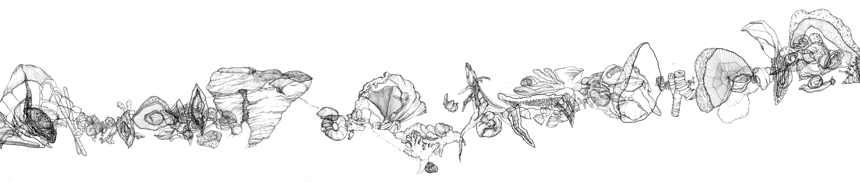 The drawings measure 441x66cm and 406x66cm.They are based on the fossil imprints found in the museum staircases.