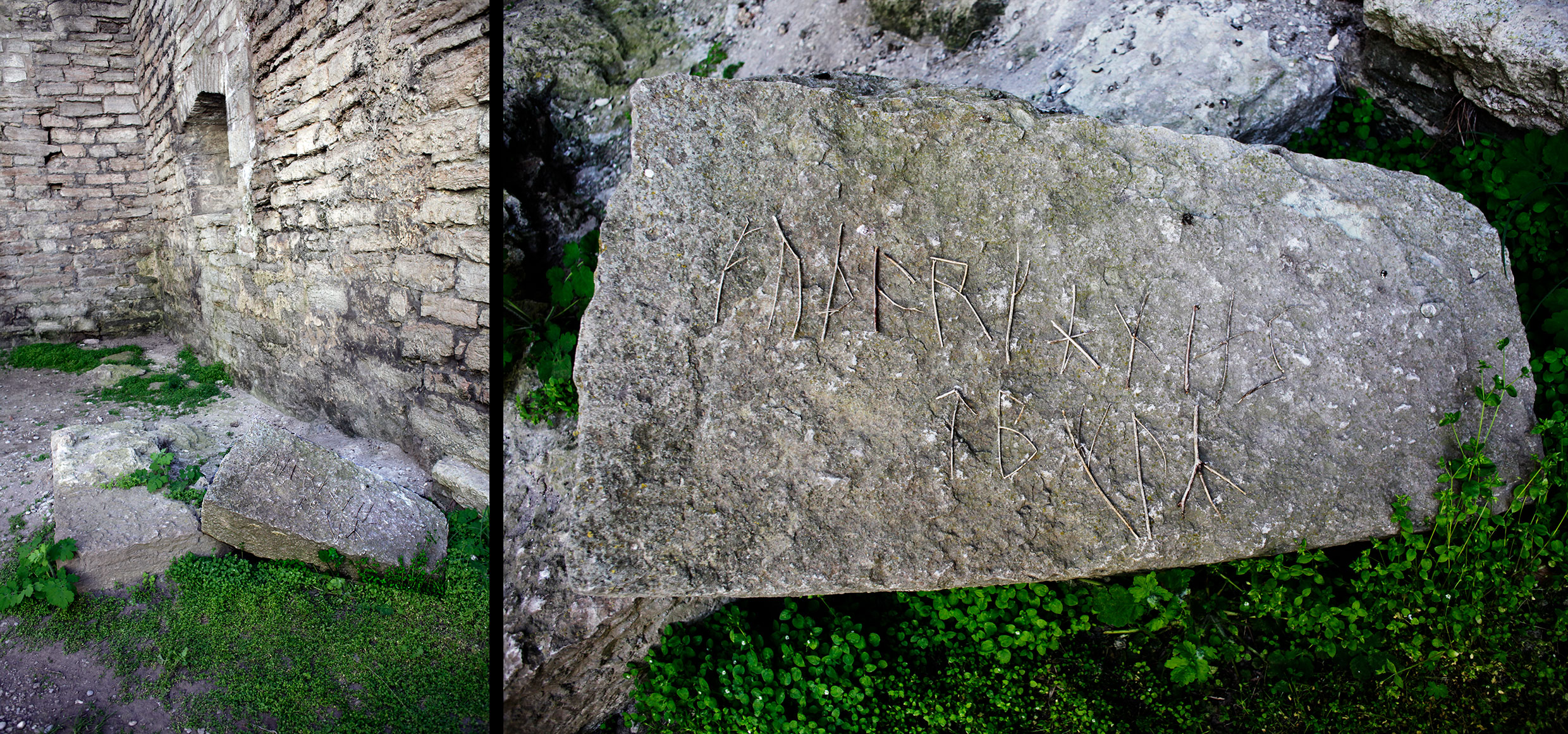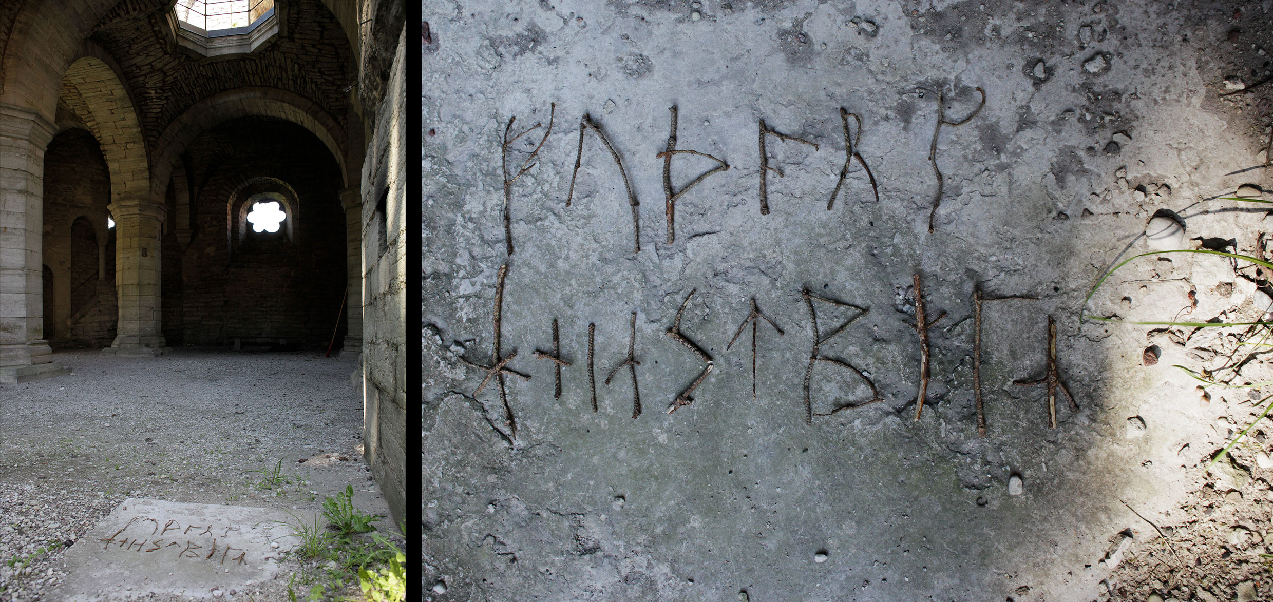 Examples of temporary graffiti using pine branches to create the rune script alphabet in the St.Hans and the St.Karin church ruins in Visby.