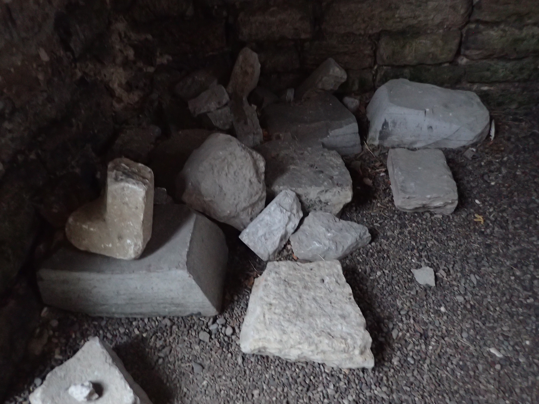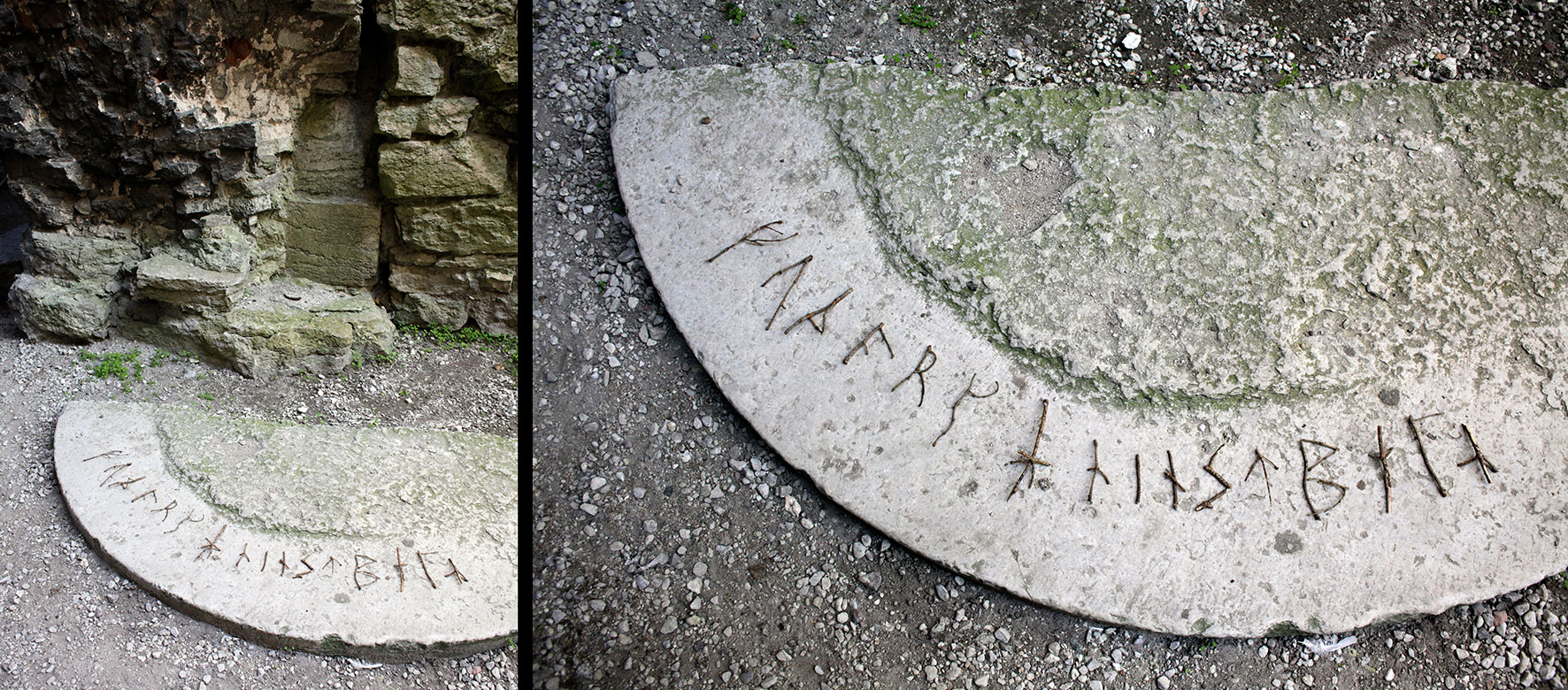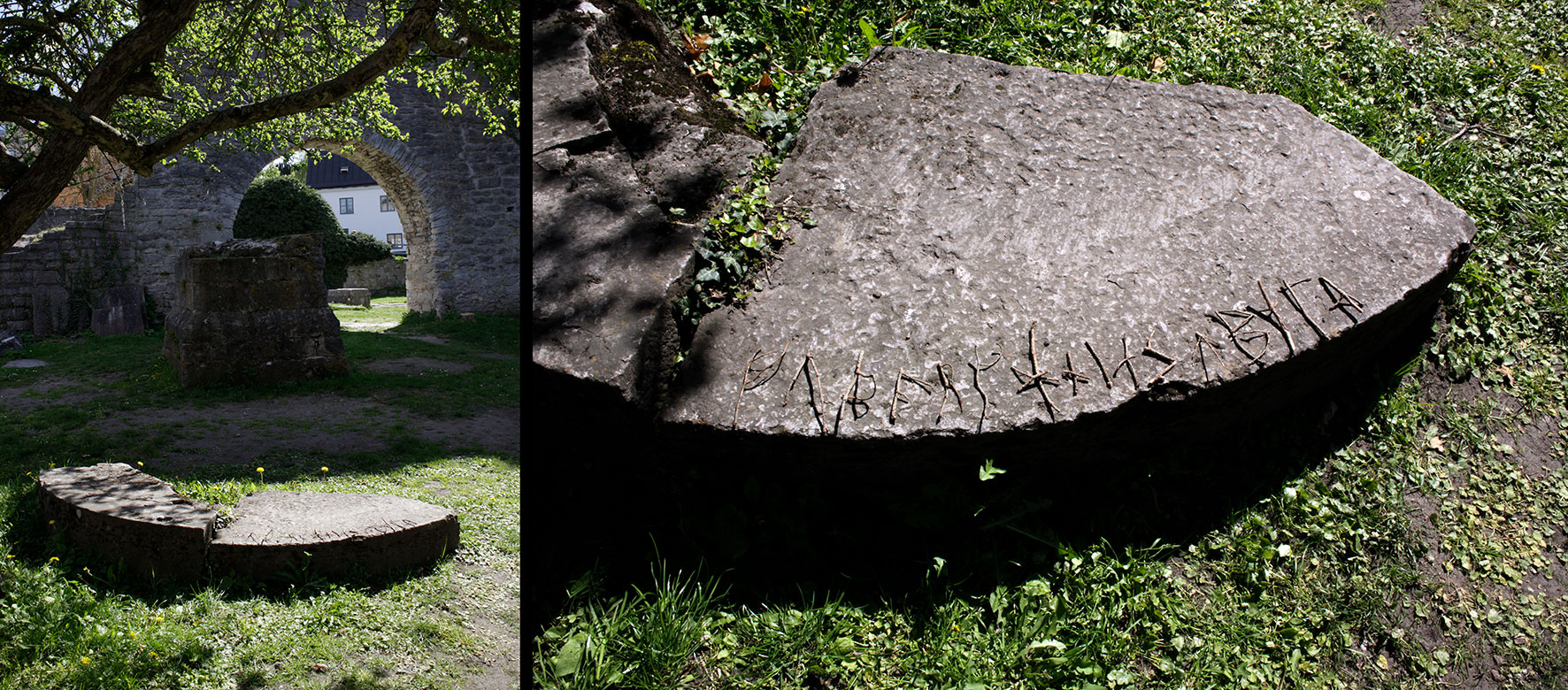 Below and above the rune script alphabet in the ruin church of the Helge And (the Holy Spirit) in Visby.