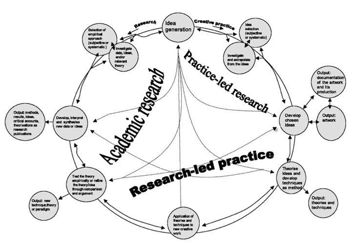 Figure 1 A model of creative arts and research processes: the iterative cyclic web of practice-led research and research-led practice. Source: Smith & Dean, 2010: 20