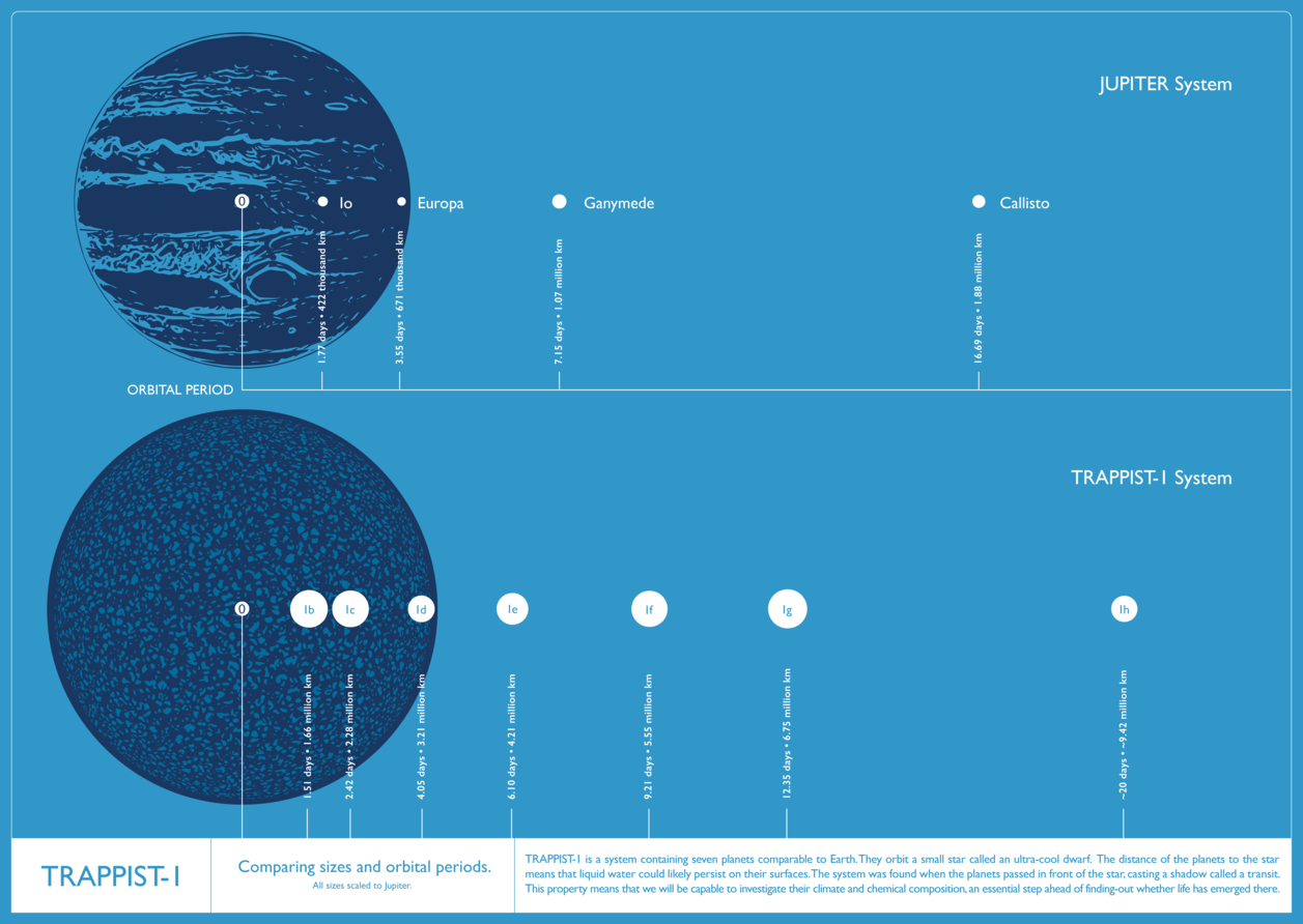 The artwork in figure 2 shows, through a comparison with Jupiter and some of its moons, the proximity of the TRAPPIST-1a star to its 7 Earth-sized orbiting planets. We can see from this image that the two systems are comparable, with the TRAPPIST-1a star being just slightly larger than Jupiter itself.