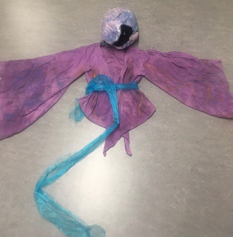In the final cycle we worked on the character of Xoe, giving her more presence by providing her with a stronger costume with a hat, makeup and a torch so she could light herself up from all around the space. This allowed her to sing from different points around the planetarium, and the use of the hat and makeup provided a different kind of characterisation which reflected the more fun and excitable parts of her character. We even had some giggles from the audience on a couple of her entrances, an encouraging sign which showed the audience were able to feel comfortable enough to not worry about taking the operatic elements of this quite jovial character too seriously. In the film of the dress rehearsal the hat was not yet complete, however you can see it below in figure 13.