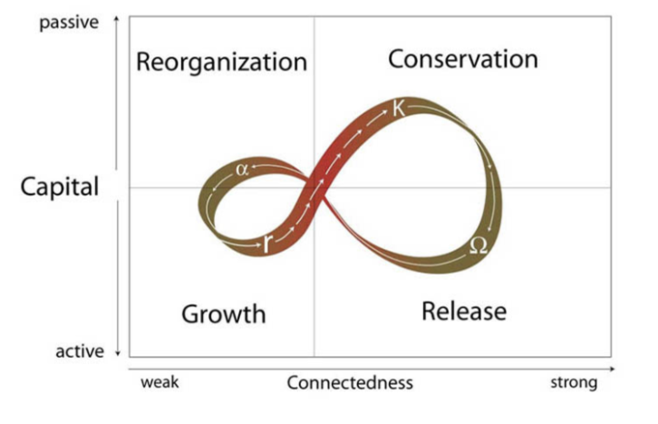The interaction of variables, e.g., drought, lightning strikes, and fuel accumulations, leads to phases of release such as forest fires, followed by periods of reorganization and regrowth. It is at the stage of reorganization that the system can shift regimes into a new or different configuration. (2009: online)