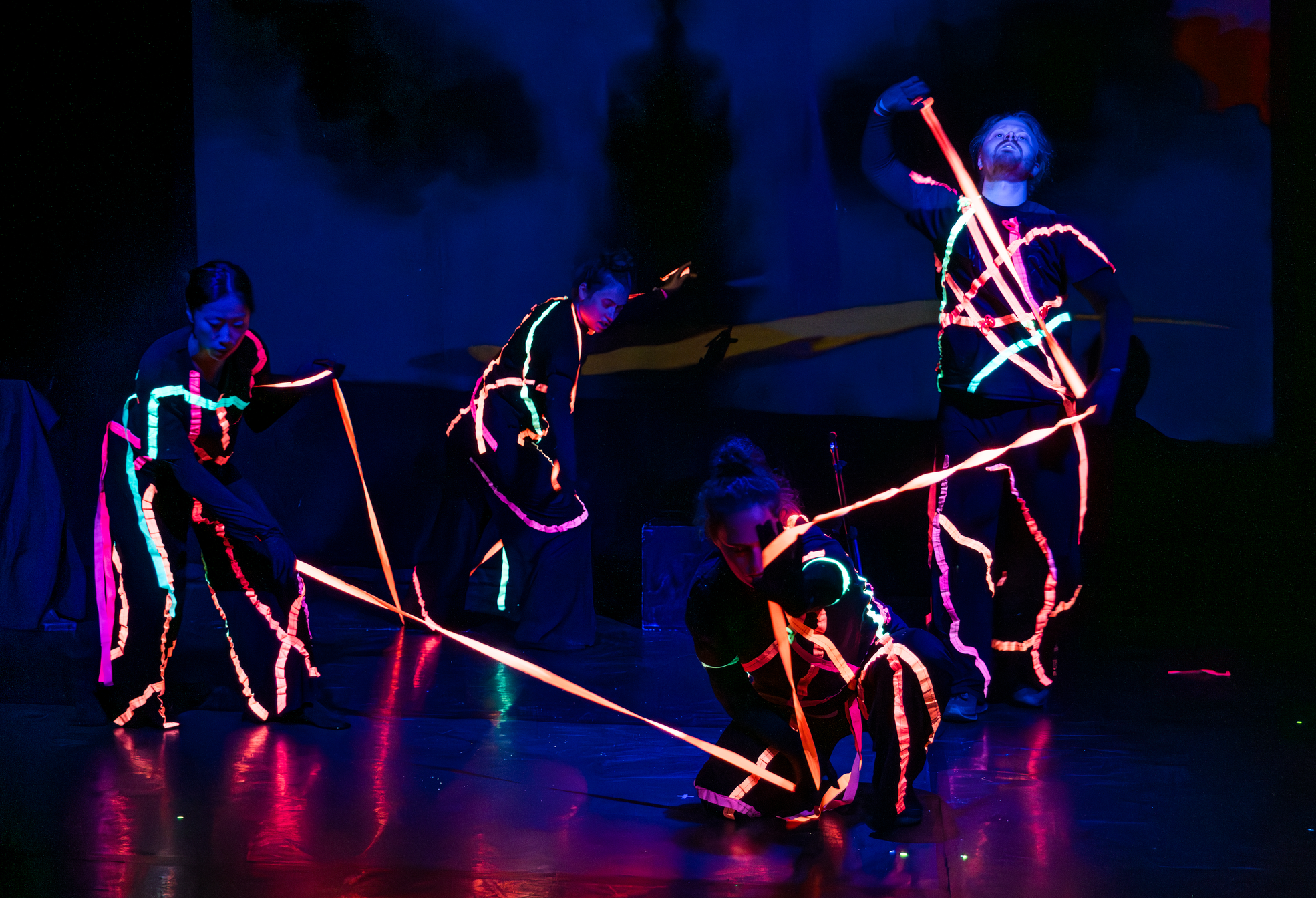 The design for the Rainforest also underwent several stages. We had collectively decided through audience and participant feedback from the third cycle that the design developed for the showcase was not reflecting the Rainforest’s network (see appendix AP 2.3for further details). Many of the performers during our post-show discussion felt that the use of balloons was unsuccessful, and myself, Oliver and Jingya all decided that the costumes themselves were making good use of Wanshu’s material but not clearly representing a network to the audience. Wanshu was not able to participate in the final cycle so we developed a new design concept without her guidance. In the second cycle we had carried out several performative workshops with Wanshu, where we focused on the use of hanging ribbons to represent the underground network. For the final cycle we decided to go back to these ideas and create costumes which would reflect the various aspects of a communicative network (see appendix AP 2.2 for details of second cycle workshops). The costumes themselves (Fig. 16) show many voices overlapping and the main prop for the scene (one UV reflective ribbon) represents one thread in the network, passing messages between the various voices in the Rainforest.