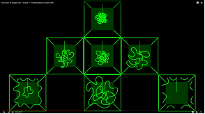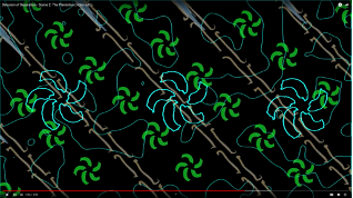 We decided to perform scene 2 to a fully recorded soundtrack, with the singers only dancing on stage to pre-recorded voices. This depersonalised the palm trees and removed their agency. It puts them into a more factory-like setting where we might not be sure if the voices heard are theirs, or what they are told to sing and feel, over some kind of tannoy. It makes a very clear distinction between the world of the Rainforest experienced in Scene 1, and the plantation. During the third cycle Jingya choreographed a sequence for us to perform to the recorded track which would help to show the palm trees as uniform workers, uncommunicative, childlike and addicted to artificially fertilised soils. We also made use of the video I had created in cycle 1 as a projection during this scene. For the palm trees I decided not to work with my body as I had discovered that I was using my body to represent the messages/materials being carried through the root and fungal network during the storm. The palm trees, however, lack this ability in comparison, and therefore I focused on animated computer-generated images for this initial stage. See timecode 00:11:13 for a performance of scene 2 (see figure 18 for example stills and Appendix AP 2.1.d for animated film).