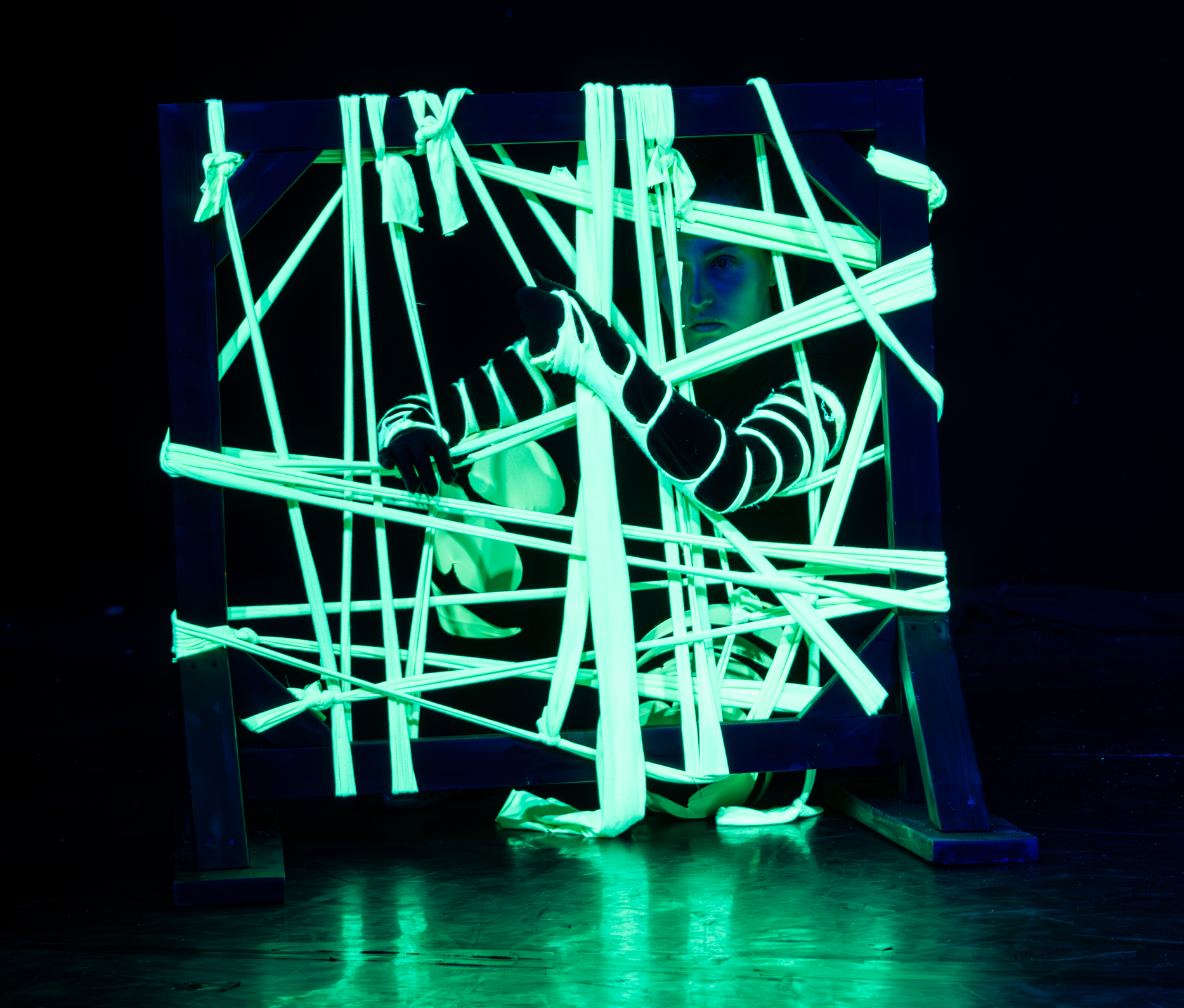 In scene 4 the Lipote tree unsuccessfully attempts to connect with the palm tree. The staging uses frames with material covering it, to show the edges of the soil that each palm tree can inhabit (see Fig. 19). They are attached by a kind of umbilical cord to the frame, which is passing the nutrients from the fertilisers above ground. The staging for this whole scene is designed to show an inability to communicate despite being adjacent in space. In the first case Lipote only confuses the palm tree 1, sending it into a short-circuited tailspin where it begins to rearrange all of the words in the two-word phrases so that they become destructive rather than productive (p. 12, line 269-270): ‘Rot fast. / Make toil. / Don’t tune. / Our spoil. / Rot fast. /Don’t oil.’ . (Please see timecode 00:34:45). In the conversation with palm tree 2 this palm tree repeats lines from its song whilst closing its roots in on Lipote as it sees it just as a source of food or potential competition. Ultimately Lipote realises that these trees are not able to communicate in the way the Rainforest needs and moves on.