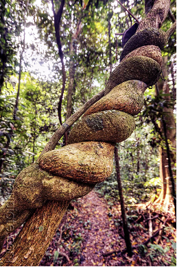 I felt it was important to include this scene, not as a pivotal development in the narrative, but as a way of exposing the highly brutal and competitive reality of living in a natural environment such as a rainforest, and the ways in which human interference can make that even harder, not only through deforestation, logging and agricultural practices. The strangulation of the other trees in the forest by this one plant is a metaphor for the strangled rainforest encircled by plantation. The Strangler Fig is only acting in its most natural manner, but in doing so it has caused the destruction of other trees, but due to its cultural prowess, this has also led to the preservation of this area of forest.