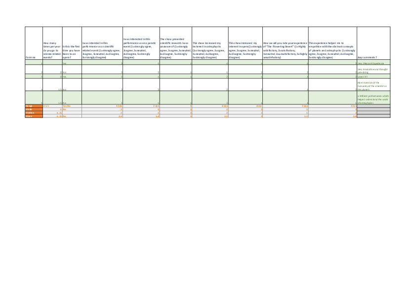 Questionnaires were handed out at this performance (ThinkTank Jan 2023). Despite the fact that tickets were sold out, I received far fewer responses. The feedback from this can be seen below. We can see from this limited response that the updates and reviews made for this production seem to have had an impact on the audience’s experience. In the space for extended feedback we did not receive any comments suggesting ways to change or enhance the production itself. We also received a fully positive response on the show’s ability to enhance empathy with the science in the show. It was also mostly viewed as a highly satisfactory experience. It also seems to have been fairly successful in increasing the audience’s interest in both opera and astrophysics. We received one piece of feedback from an unknown audience member on Instagram after the show saying: