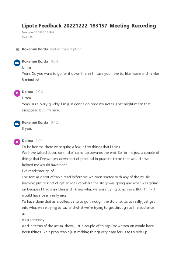 We then held a meeting with all the cast and collaborators to gain feedback from everyone. The feedback gathered here was put into use as we moved forwards into the fourth cycle. Mostly we focused on making some edits to tighten up the dramaturgical structure, redesigning scene 1, and making use of projections during the performance. The transcription from this feedback can be found bottom left.