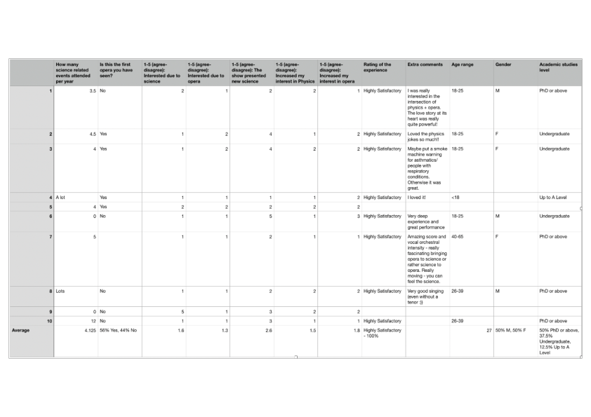 This proved successful with our audience, and greatly added to the performance, allowing the non-physicists to feel as part of the show and as engaged with its story, as the physics experts in the audience. A subsequent Facebook comment posted on the Infinite Opera page can be seen below. The outcome from the questionnaire can also be seen in this table below.
