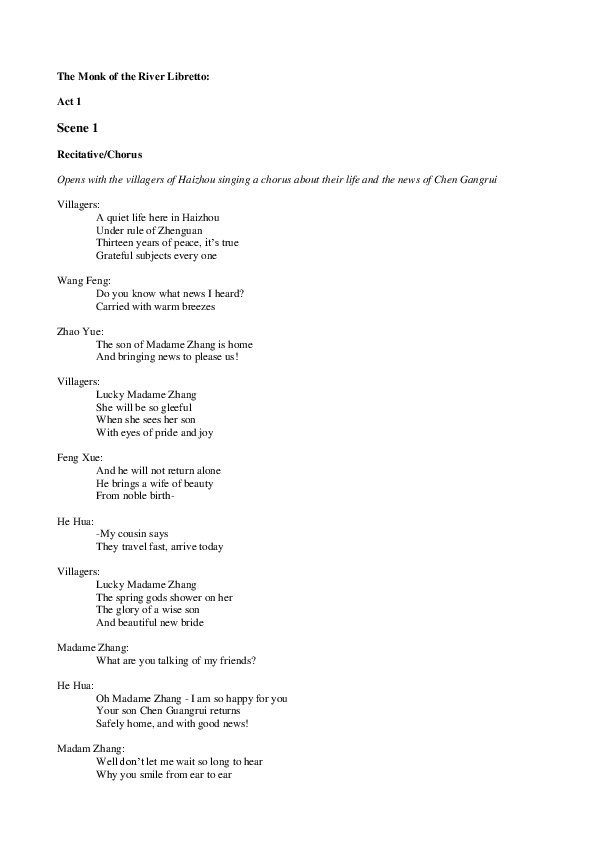 The first of these operas, The Monk of the River, was written during 2020 and performed at the Tête Á Tête Festival in September 2021. The production was funded by Arts Council England. This part of the novel tells the story of Xuanzang’s parents, and describes how he came to be a monk of the Emperor Tang. There are many characters, each with their own plot, and so it was a very dense story to portray in a one hour show. If I were able to go back and rework this I would ask Anna if we could cut out some characters and streamline the story to fewer key events. The libretto for this opera can be found on the right.