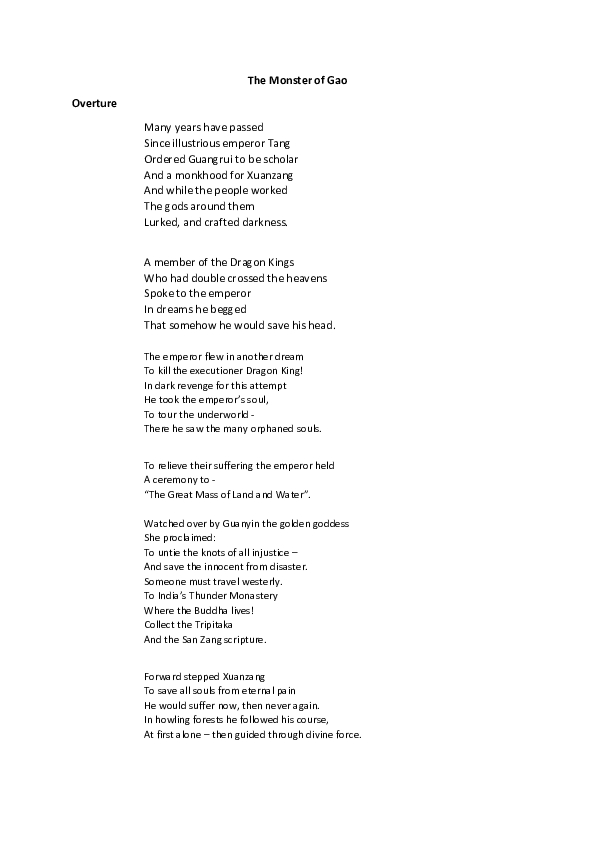 In September 2023 The Monster of Gao premiered again at the Tête Á Tête Festival. After having worked on such a complicated story for the previous instalment I asked Anna if we could focus on a less complicated element of the journey, which involves fewer characters and would allow us to explore each character more fully. We decided to focus on the introduction of the Pig character Zhu Bajie. The libretto for this work can be found on the right.