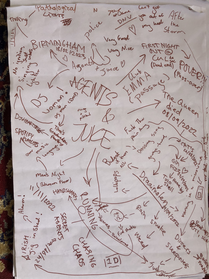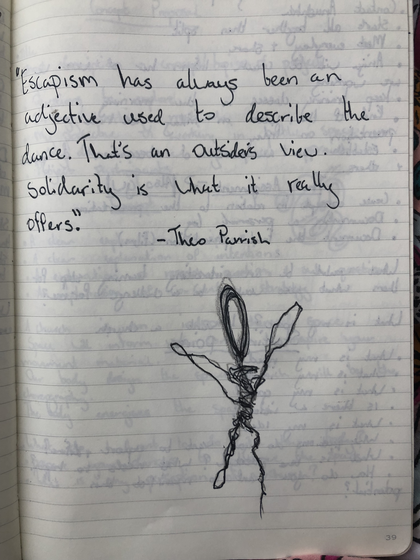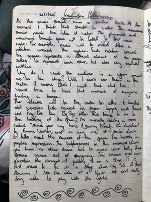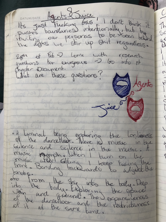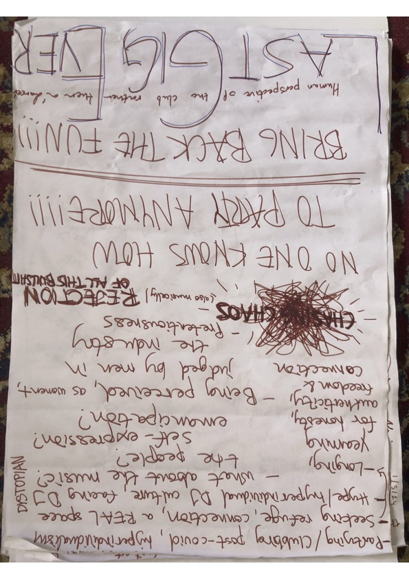 To wrap this section up, I would say that this research is strongly rooted in the perception of time. Maybe not in a sense of a fast-moving performance or a slow-moving performance but, to jumping back and forth and round to moments when I felt free on the dancefloor or to a period that I might not have experienced but am inspired by (like in Emma’s book). Again, I want people to see my perspective. Maybe it won’t look like a club to them? Maybe that’s what I want?