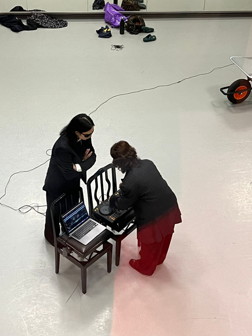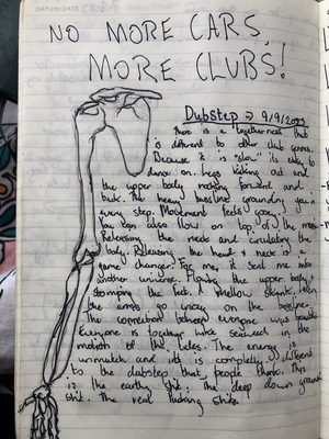 To continue, I was also in a deep dive into dubstep sound system culture through the writings of Emma Warren, who describes beautifully how it felt to be a woman in the Dubstep environment. Just being a body in a space that allowed her to feel fully free. So, this music genre and culture became a catalyst for the movement material of the Performance. The basslines and the darkness of the music was comforting to move on. And thus, a music to movement methodology was birthed.