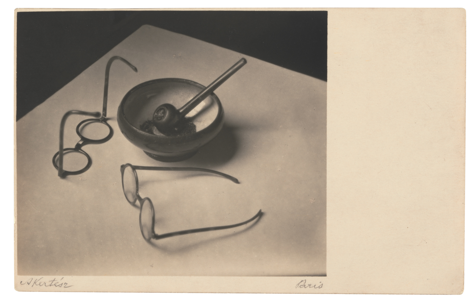 But absence had already been an important ingredient in Kertész’s work in the 1920s. In the exquisitely minimal image Mondrian’s Glasses and Pipe (1926) two pairs of round-lensed spectacles accompany a pipe and ashtray on a light bench whose corner forms a vertex near the centre of the top edge. The composition dialogues in jest with the painter’s own recent “lozenge”-shaped works and with his “neo-plastic” aesthetic philosophy of giving “truth in the way of beauty” (van Doesburg 1992: 281) through the organization of pure abstract forms that bypass representation. Kertész, instead, gives us Mondrian through his attributes: a Mondrian, moreover, who relies on tools to see and whose sense of spirit may well come with the rush of tobacco. And this remarkable meeting of portrait in absentia and still life is performed with a tightness of focus that, in leaving the upstanding arms of one pair of spectacles in a gentle blur, ensures the photographic mediation of the image will remain clearly perceptible.