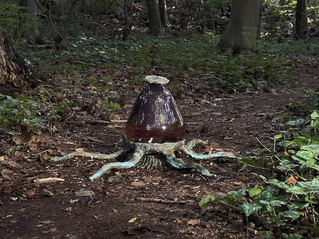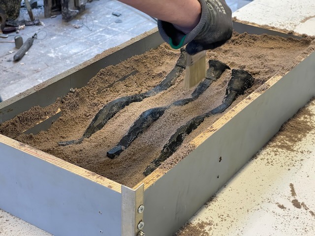 Putting together the parts of the sculpture. The bronze objects casted in sand, the glass chambers blown by human breath and sculpted with gravity and hands, the electronics that are a result of humans complex technological quest. There lies always a certain absurdity in our operations. This time, mixed with an ethos of regeneration. But the process doesn't regenerate the natural surroundings, it doesn't protect, create or restore habitats. The regeneration is directed to the human body. It is a devide with measuring sensors, but the outcome is not numerical. The sensor itself is a metaphor for connection per se, for the acknowledgement of the overlooked agencies. And the resonance that the soil's humidity and temperature data manipulates – a resonance that happens on the terms of that particular unique glass shape that took place – is a signal to our bodies, not to be understood anymore as a numeric value but as a happening of attention.