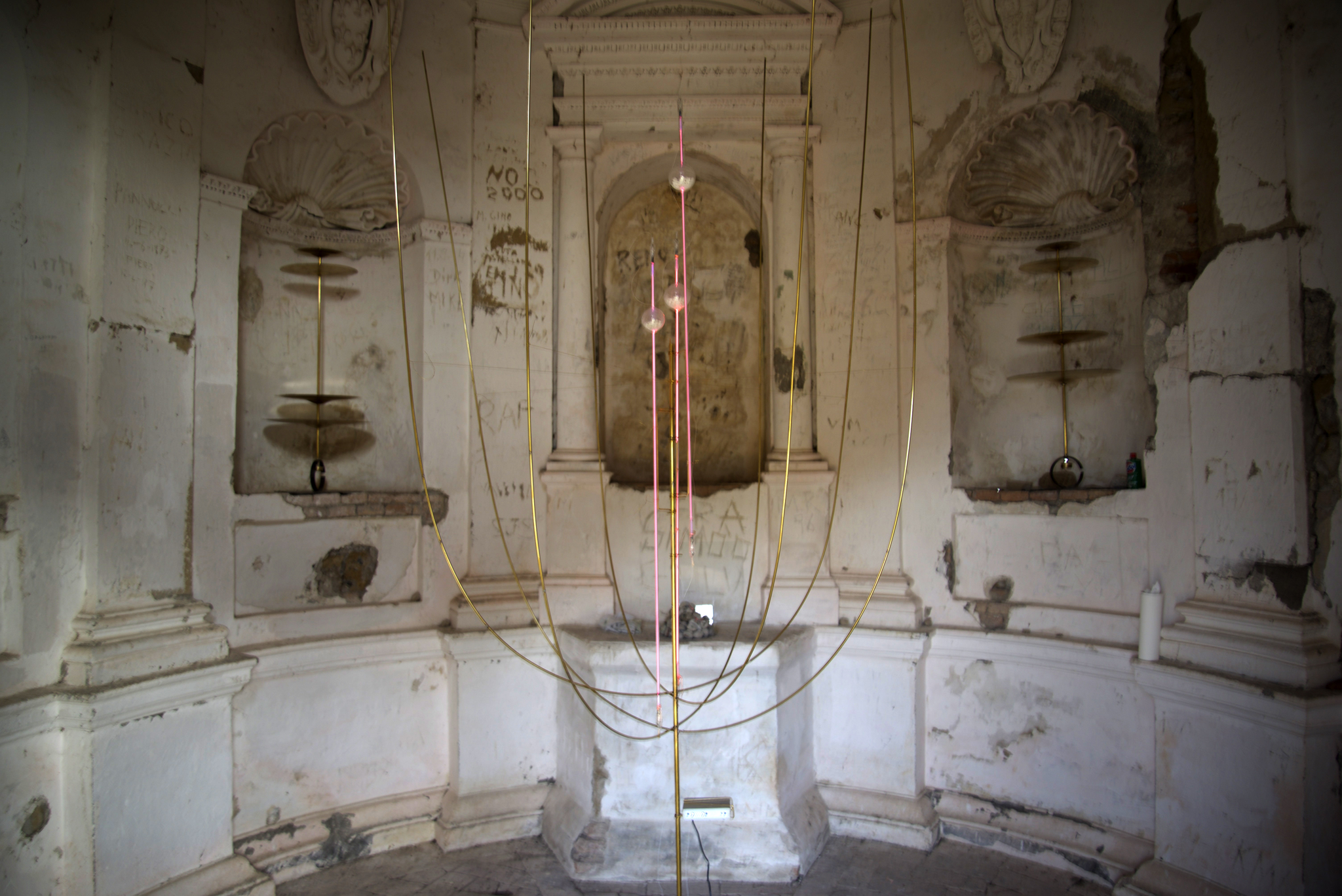 Vertical sculptures made of brass cymbals are in the niches next to the chapel's altar. They vibrate reflecting the oscillations of the lake, which are recorded by a hydrophone located under the surface of the lake. Finally, on the altar there is a pile of pumice stones. Holes have been created into the stones to host micro-magnets. These magnets, while vibrating under the influence of an electromagnetic field, erode and carve the stones from the inside, as if they were being attacked by woodworm. The frequencies used to stimulate the crumbling and consumption of the stones are again those of the Schumann resonance. The entire installation was powered by a solar energy system for the entire duration of the exhibition.
